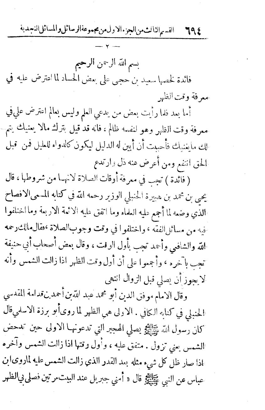 أمّا بعد فلما رأيت بعض من يدعي العلم وليس بعالم اعترض علي في معرفة وقت الظّهر وهو لنفسه ظالم، فإنّه قد قيل بترك ما لا يعنيك يتم لك ما يغنيك فأحببت أن أبين له الدّليل ليكون كالدّواء للعليل فمن قبل الحق انتفع ومن أعرض عنه ذل وارتدع.