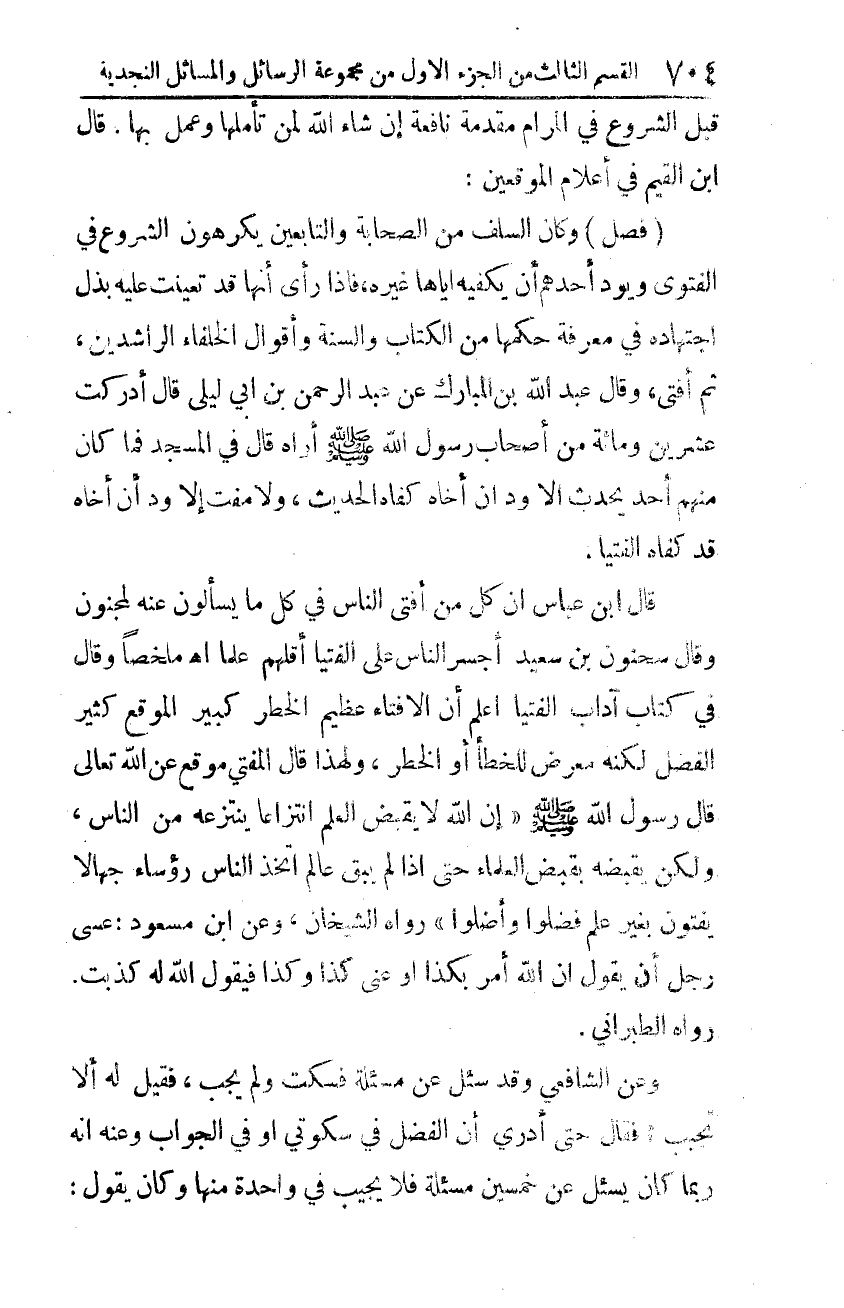 (فصل): وكان السّلف من الصّحابة والتّابعين يكرهون الشّروع في الفتوى ويود أحدكم أن يكفيه إياها غيره، فإذا رأى أنّها قد تعينت عليه بذل اجتهاده في معرفة حكمها من الكتاب والسّنة وأقوال الخلفاء الرّاشدين، ثمّ أفتى، وقال عبد الله بن المبارك عن عبد الرّحمن بن أبي ليلى قال: أدركت عشرين ومائة من أصحاب رسول الله -صلّى الله عليه وسلّم- أراه قال في المسجد فما كان منهم أحد يحدث إلا ود أن أخاه كفاه الحديث، ولا مفت إلّا ود أن أخاه قد كفاه الفتيا.