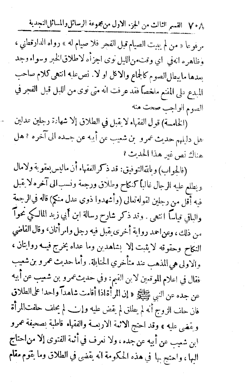 (الخامسة): قول الفقهاء: لا يقبل في الطّلاق إلّا شهادة رجلين عدلين هل دليلهم حديث عمرو بن شعيب عن أبيه عن جدّه إلى آخره، هل هناك نصّ غير هذا الحديث؟