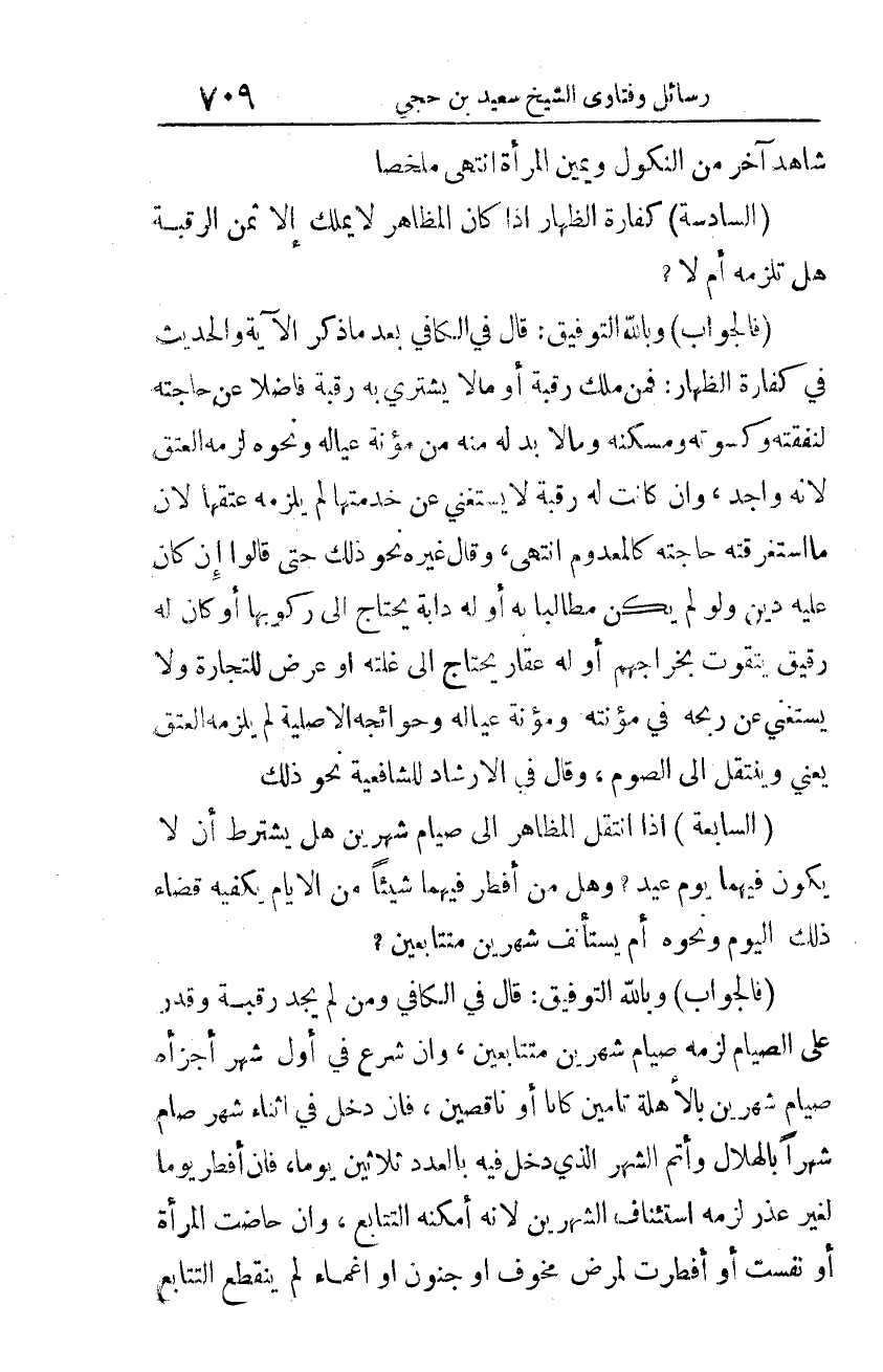 (فالجواب): -وبالله التّوفيق-: قال في الكافي بعد ما ذكر الآية والحديث في كفارة الظّهار: فمن ملك رقبة أو مالا يشتري به رقبة فاضلًا عن حاجته لنفقته وكسوته ومسكنه وما لا بدّ له منه من مؤنة عياله ونحوه لزمه العتق لأنّه واجد، وإن كانت له رقبة لا يستغني عن خدمتها لم يلزمه عتقها؛ لأنّ ما استغرقته حاجته كالمعدوم انتهى، وقال غيره نحو ذلك حتى قالوا: إن كان عليه دين ولو لم يكن مطالبًا به أو له دابة يحتاج إلى ركوبها أو كان له رقرق يتقوت بخراجهم أو له عقار يحتاج إلى غلته أو عرض للتّجارة ولا يستغني عن ربحه في مؤنته ومؤنة عياله وحوائجه الأصلية لم يلزمه العتق؛ يعني وينتقل إلى الصّوم، وقال في الإرشاد للشّافعية نحو ذلك.