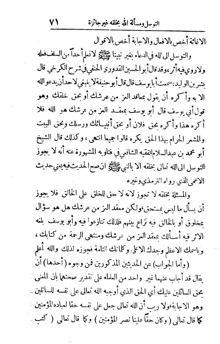 وكذلك قال الشيخ أبو محمد بن عبد السلام الفقيه الشافعي في فتاويه المشهورة عنه: أنه لا يجوز التوسل إلى الله تعالى بخلقه، إلا بالنبي صلى الله عليه وسلم إن صح الحديث فيه، يعني حديث الأعمى الذي رواه الترمذي وغيره.