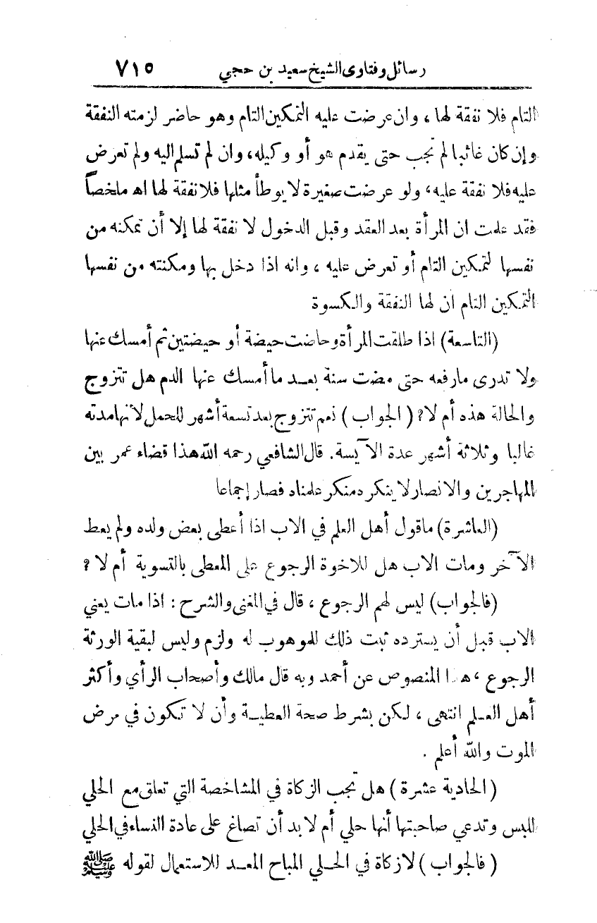 (الجواب): نعم تتزوّج بعد تسعة أشهر للحمل؛ لأنّها مدّته غالبًا وثلاثة أشهر عدة الآيسة. قال الشّافعي -رحمه الله- هذا قضاء عمر بين المهاجرين والأنصاري لا ينكره منكر علمناه فصار إجماعًا.