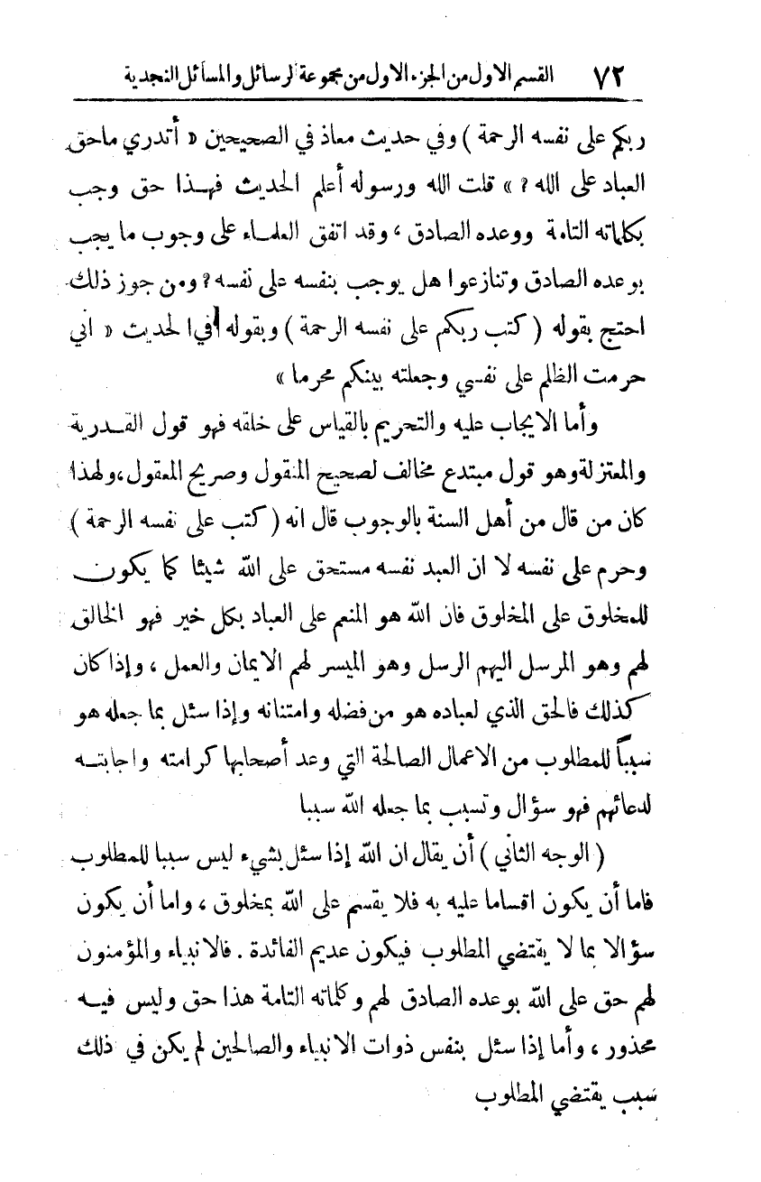 وأما الإيجاب عليه والتحريم بالقياس على خلقه، فهو قول القدرية والمعتزلة؛ وهو قول مبتدع مخالف لصحيح المنقول وصريح المعقول؛ ولهذا كان من قال من أهل السنة بالوجوب قال: إنه: {كَتَبَ رَبُّكُمْ عَلَى نَفْسِهِ الرَّحْمَةَ} [الأنعام من الآية: 54]، وحرم على نفسه، لا أن العبد نفسه مستحق على الله شيئا كما يكون للمخلوق على المخلوق؛ فإن الله هو المنعم على العباد بكل خير، فهو الخالق لهم وهو المرسل، إليهم الرسل وهو الميسر لهم الإيمان والعمل. وإذا كان كذلك فالحق الذي لعباده هو من فضله وامتنانه، وإذا سئل بما جعله هو سببا للمطلوب من الأعمال الصالحة التي وعد أصحابها كرامته وإجابته لدعائهم، فهو سؤال وتسبب بما جعله الله سببا.