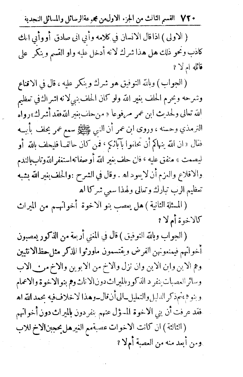 (الجواب وبالله التّوفيق): قال في المغني أربعة من الذّكور يعصبون أخواتهم فيمنعونهنّ الفرض ويقتسمون ما ورثوا للذكر مثل حظ الأنثيين وهم: الابن وابن الابن وإن نزل والأخ من الأبوين والأخ من الأب وسائر العصبات ينفرد الذّكور بالميراث دون الإناث وهم بنو الإخوة والأعمام وبنوهم، ثمّ ذكر الدّليل والتّعليل -إلى أن قال- وهذا لا خلاف فيه بحمد الله اهـ فقد عرفت أن بني الإخوة المسؤول عنهم ينفردون بالميراث دون أخواتهم.