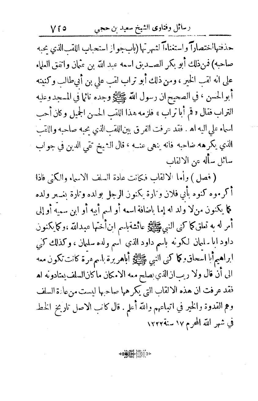 (فصل): وأمّا الألقاب فكانت عادة السّلف الأسماء والكنى فإذا أكرموه كنوه بأبي فلان وتارة يكنون الرّجل بولده وتارة بغير ولده كما يكنون مَن لا ولد له إمّا بإضافة اسمه أو اسم أبيه أو ابن سميه أو إلى أمر له به تعلق كما كنَّى النَّبِيّ -صلّى الله عليه وسلّم- عائشة باسم ابن أختها عبد الله، وكما يكنون داود أبا سليمان لكونه باسم داود الّذي اسم ولده سليمان، وكذلك كنَّي إبراهيم أبا إسحاق وكما كنَّى النَّبِيّ -صلّى الله عليه وسلّم- أبا هريرة باسم هرة كانت تكون معه إلى أن قال ولا ريب أن الّذي يصلح معه الإمكان ما كان السّلف يعتادونه اهـ، فقد عرفت أنّ هذه الألقاب الّتي يكرهها صاحبها ليست من عادة السّلف وهم القدوة والخير في اتّباعهم والله أعلم. قال كاتب الأصل تاريخ الخط في شهر الله المحرّم 17 سنة 1222 هـ.