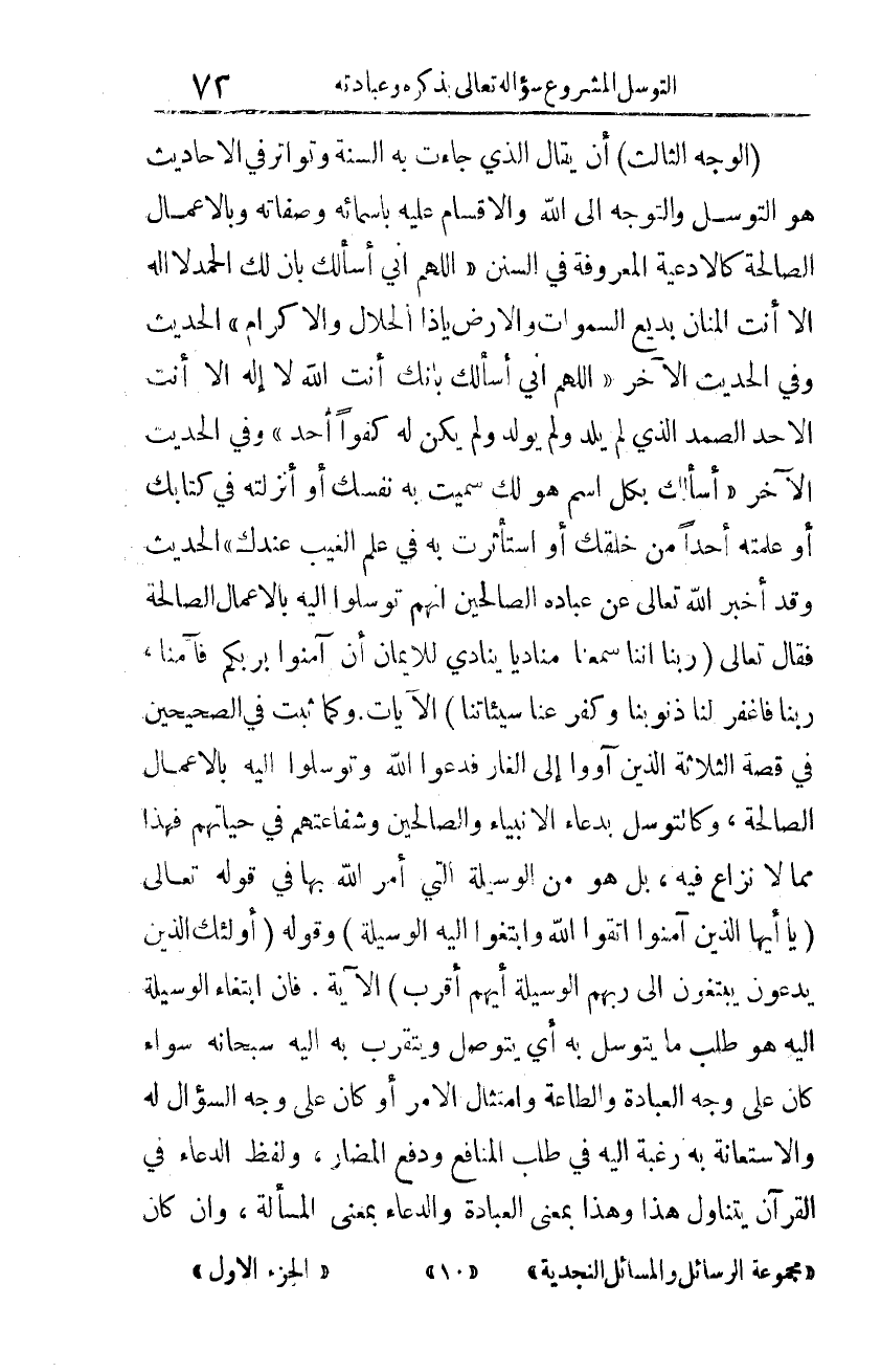 (الوجه الثالث): أن يقال: الذي جاءت به السنة وتواتر في الأحاديث هو التوسل والتوجه إلى الله والإقسام عليه بأسمائه وصفاته، وبالأعمال الصالحة كالأدعية المعروفة في السنن: "اللهم إني أسألك بأن لك الحمد، لا إله إلا أنت المنان، بديع السموات والأرض، يا ذا الجلال والإكرام"1 الحديث. وفي الحديث الآخر: "اللهم إني أسألك بأنك أنت الله، لا إله إلا أنت، الأحد الصمد، الذي لم يلد ولم يولد، ولم يكن له كفوا أحد"2.