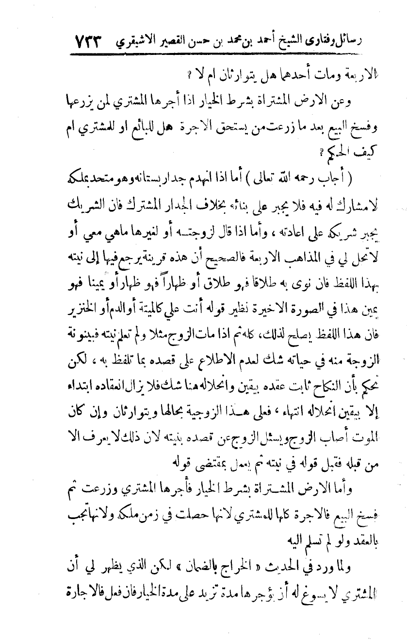 أجاب -رحمه الله تعالى-: أمّا إذا انهدم جدار بستانه وهو متّحد بملكه لا مشارك له فيه فلا يجبر على بنائه بخلاف الجدار المشترك، فإنّ الشّريك يجبر شريكه على إعادته.