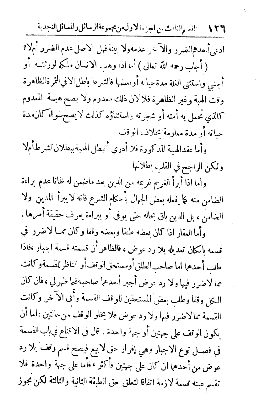 (أجاب رحمه الله تعالى): أمّا إذا وهب الإنسان ملكه لورثته أو أجنبي واستثنى الغلة مدة حياته أو بعضها فالشّرط باطل إلّا في الثّمرة الظّاهرة وقت الهبة وغير الظّاهر فلا؛ لأنّ ذلك معدوم فلا يصح هبة المعدوم كالّذي تحمل به أمته أو شجرة واستثناؤه كذلك لا يصحّ سواء كان مدة حياته أو مدة معلومة بخلاف الوقف.