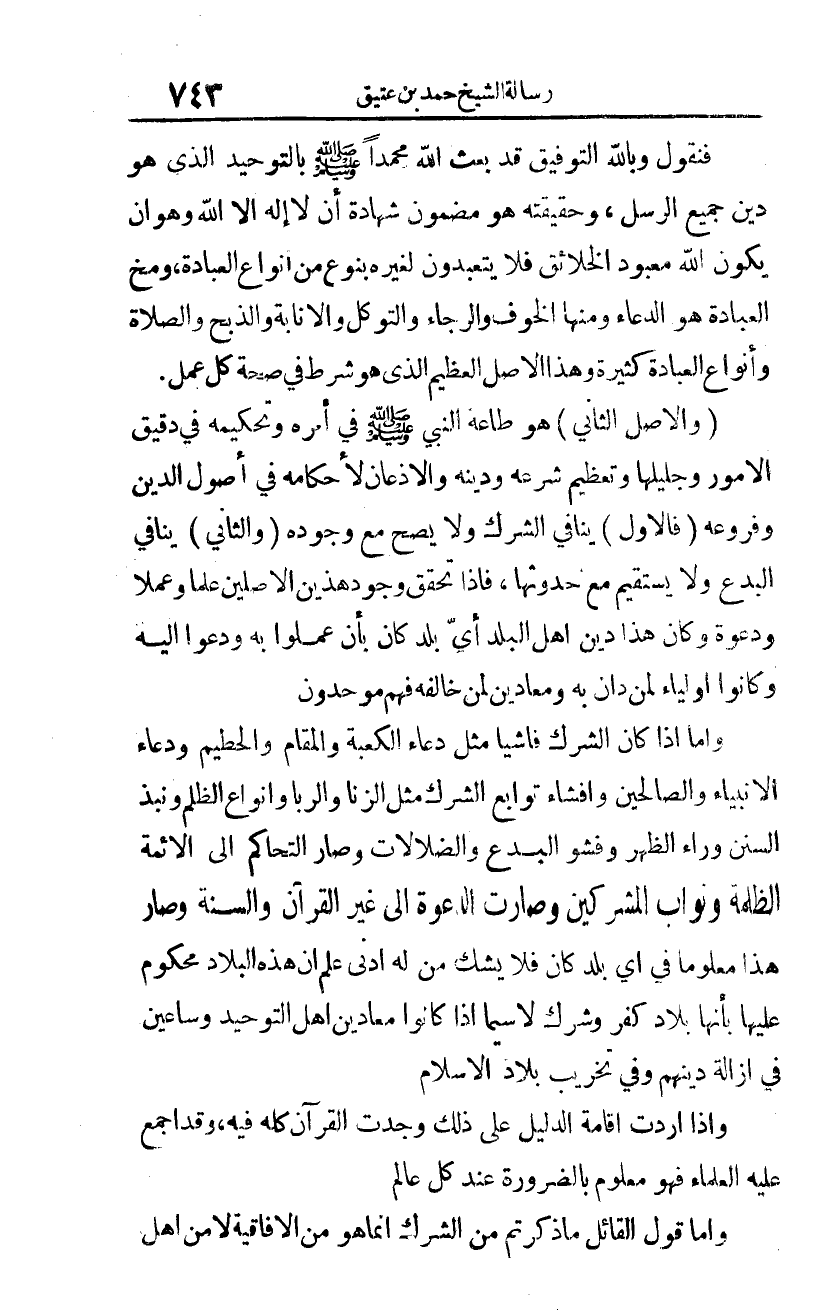(والثّاني): ينافي البدع ولا يستقيم مع حدوثها، فإذا تحقق وجود هذين الأصلين علمًا وعملًا ودعوةً، وكان هذا دين أهل البلد أيّ بلد كان بأن عملوا به ودعوا إليه وكانوا أولياء لمن دان به ومعادين لمن خالفه فهم موحدون.