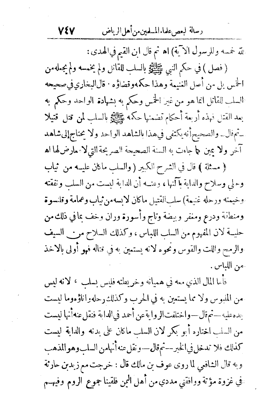 (فصل): في حكم النّبيّ -صلّى الله عليه وسلّم- بالسّلب للقاتل ولم يخمسه ولم يجعله من الخمس بل من أصل الغنيمة وهذا حكمه وقضاؤه. قال البخاري في صحيحه: السّلب للقاتل إنّما هو من غير الخمس وحكم به بشهادة الواحد وحكم به بعد القتل؛ فهذه أربعة أحكام تضمّنها حكمه -صلّى الله عليه وسلّم- بالسّلب لمن قتل قتيلا -ثمّ قال- والصّحيح أنّه يكتفى في هذا بالشّاهد الواحد ولا يحتاج إلى شاهد آخر ولا يمين كما جاءت به السّنّة الصّحيحة الصّريحة الّتي لا معارض لها اهـ.