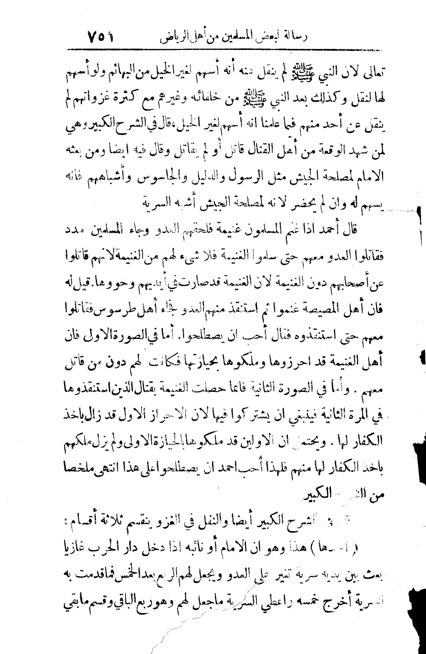 تعالى؛ لأنّ النّبيّ -صلّى الله عليه وسلّم- لم ينقل عنه أنّه أسهم لغير الخيل من البهائم ولو أسهم لها لنقل وكذلك بعد النّبيّ -صلّى الله عليه وسلّم- من خلفائه وغيرهم مع كثرة غزواتهم لم ينقل عن أحد منهم فيما علمنا أنّه أسهم لغير الخيل، قال في الشّرح الكبير وهي لمن شهد الوقعة من أهل القتال قاتل أو لم يقاتل وقال فيه أيضا ومن بعثه الإمام لمصلحة الجيش مثل الرّسول والدّليل والجاسوس وأشباههم فإنّه يسهم له وإن لم يحضر لأنّه لمصلحة الجيش أشبه السّريّة.