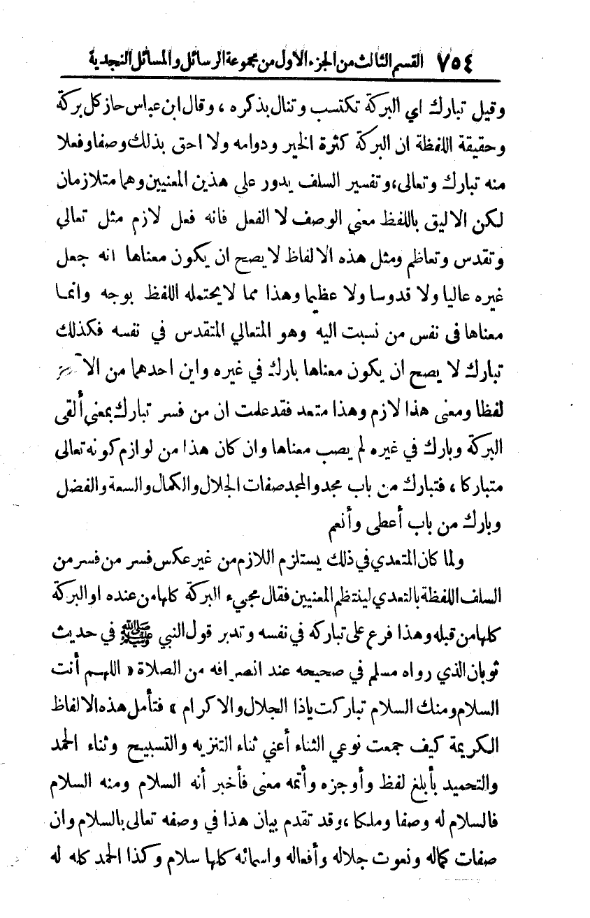ولمّا كان المتعدّي في ذلك يستلزم الّلازم من غير عكس فسّر من فسّر من السّلف اللّفظة بالتّعدي لينتظم المعنيين فقال مجيء البركة كلّها من عنده أو البركة كلّها من قبله، وهذا فرع على تباركه في نفسه وتدبّر النّبيّ -صلّى الله عليه وسلّم- في حديث ثوبان الّذي رواه مسلم في صحيحه عند انصرافه من الصّلاة: "اللهمّ أنت السّلام ومنك السّلام تباركت يا ذا الجلال والإكرام"، فتأمّل هذه الألفاظ الكريمة كيف جمعت نوعي الثّناء أعني ثناء التّنْزيه والتّسبيح، وثناء الحمد والتّحميد بأبلغ لفظ وأوجزه وأتمّه معنى فأخبر أنّه السّلام ومنه السّلام، فالسّلام له وصفًا وملكًا، وقد تقدّم بيان هذا في وصفه تعالى بالسّلام، وأنّ صفات كماله ونعوت جلاله وأفعاله وأسمائه كلّها سلام.