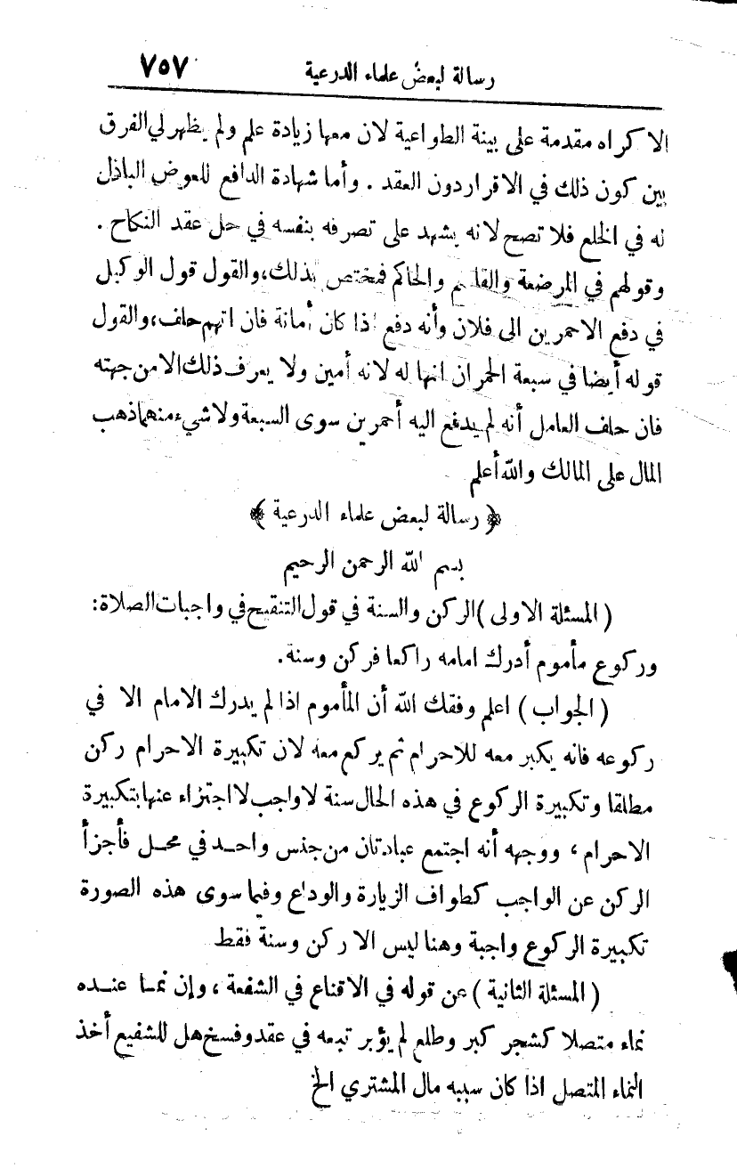 (الجواب): اعلم وفقك الله أنّ المأموم إذا لم يدرك الإمام إلّا في ركوع فإنّه يكبّر معه للإحرام ثمّ يركع معه؛ لأنّ تكبيرة الإحرام ركن مطلقًا وتكبيرة الرّكوع في هذه الحال سنّة لا واجب؛ لا اجتزاء عنها بتكبيرة الإحرام، ووجهه أنّه اجتمع عبادتنان من جنس واحد في محل فأجزأ الرّكن عن الواجب؛ كطواف الزّيارة والوداع، وفيما سوى هذه الصّورة تكبيرة الرّكوع واجبة وهنا ليس إلّا ركن وسنّة فقط.