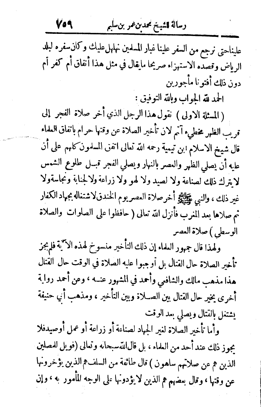 (المسألة الأولى): نقول هذا الرجل الّذي أخر صلاة الفجر إلى قريب الظّهر مخطيء آثم؛ لأنّ تأخير الصّلاة عن وقتها حرام باتفاق العلماء. قال شيخ الإسلام ابن تيمية -رحمه الله تعالى- اتّفق المسلمون كلّهم على أن عليه أن يصلي الظّهر والعصر بالنّهار، ويصلّي الفجر قبل طلوع الشّمس لا يترك ذلك لصناعة ولا لصيد ولا لهو ولا زراعة ولا لجنابة ونجاسة ولا غير ذلك، والنّبيّ -صلّى الله عليه وسلّم- أخر صلاة العصر يوم الخندق لاشتغاله بجهاد الكفّار ثمّ صلاها بعد المغرب فأنزل الله تعالى: {حَافِظُوا عَلَى الصَّلَوَاتِ وَالصَّلاةِ الْوُسْطَى} [البقرة، من الآية: 238]، صلاة العصر.