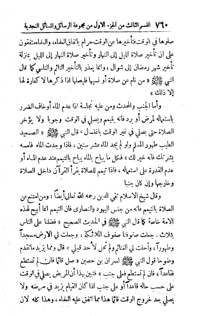 وقال شيخ الإسلام تقيّ الدّين -رحمه الله تعالى- أيضًا: ومن امتنع عن الصّلاة بالتيمّم فإنّه من جنس اليهود والنّصارى، فإنّ التيمّم إنّما أبيح لهذه الأمّة خاصة كما قال النّبيّ -صلّى الله عليه وسلّم- في الحديث الصّحيح: "فضلنا على النّاس بثلاث: جعلت صفوفنا صفوف الملائكة، وجعلت لي الأرض مسجدًا وطهورًا، وأحلت لي الغنائم ولم تحل لأحد قبلي". قال: وممّا يزيد ما تقدّم وضوحًا قول النّبيّ -صلّى الله عليه وسلّم- لعمران بن حصين: "صل قائمًا فإن لم تستطع فقاعدًا، فإن لم تستطع فعلى جنب". فتبيّن بهذا أنّ المريض يصلّي في الوقت على حسب حاله قاعدًا أو على جنب إذا كان القيام يزيد في مرضه، ولا يصلّي بعد خروج الوقت قائمًا هذا ممّا اتّفق عليه العلماء، وهذا كلّه لأنّ