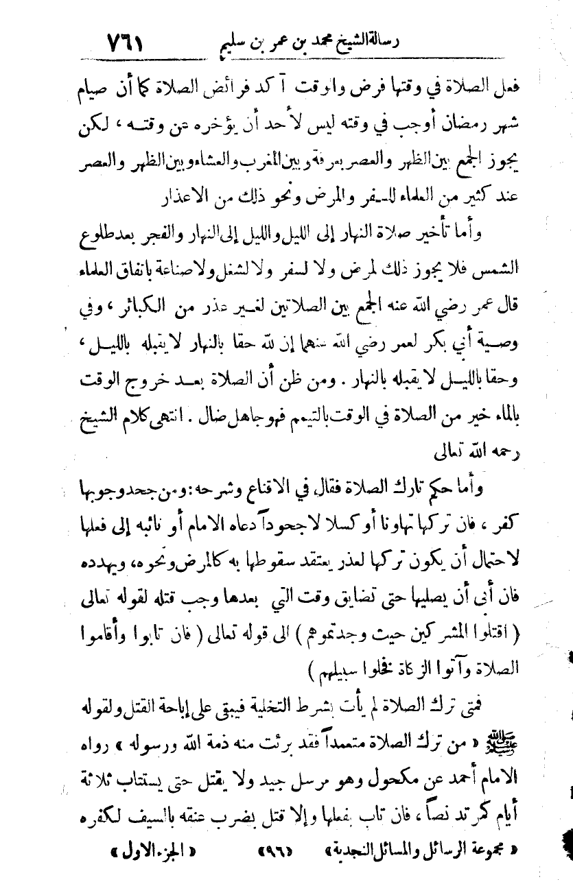 وأمّا تأخير صلاة النّهار إلى اللّيل واللّيل إلى النّهار والفجر بعد طلوع الشّمس فلا يجوز لمرض ولا لسفر ولا لشغل ولا صناعة باتّفاق العلماء، قال عمر -رضي الله عنه-: الجمع بين الصّلاتين لغير عذر من الكبائر، وفي وصيّة أبي بكر لعمر -رضي الله عنهما-: إنّ لله حقّا بالنّهار لا يقبله باللّيل، وحقّا باللّيل لا يقبله بالنّهار. ومن ظنّ أنّ الصّلاة بعد خروج الوقت بالماء خير من الصّلاة في الوقت بالتّيمّم فهو جاهل ضال. انتهى كلام الشّيخ -رحمه الله تعالى-.
