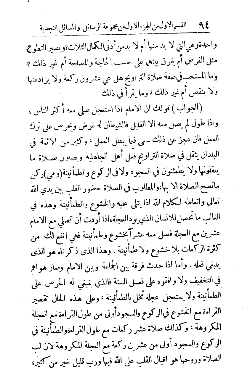 (الجواب): قولك: إن الإمام إذا استعجل صلى معه أكثر الناس، وإذا طوّل لم يصل معه إلا القليل؛ فالشيطان له غرض، ويحرص على ترك العمل؛ فإن عجز عن ذلك سعى فيما يبطل العمل. وكثير من الأئمة في البلدان يثقل في صلاة التراويح فعل أهل الجاهلية، ويصلون صلاة ما يعقلونها ولا يطمئنون في السجود ولا في الركوع والطمأنينة (وهي) ركن ما تصح الصلاة إلا بها؛ والمطلوب في الصلاة حضور القلب بين يدي الله تعالى، واتعاظه لكلام الله إذا يتلى عليه، والخشوع، والطمأنينة، وهذه في الغالب ما تحصل للإنسان الذي يود العجلة. إذا أردت أن تصلي مع الإمام عشرين مع العجلة فصل معه عشرا بخشوع وطمأنينة فهي أنفع لك من كثرة الركعات بلا خشوع ولا طمأنينة.