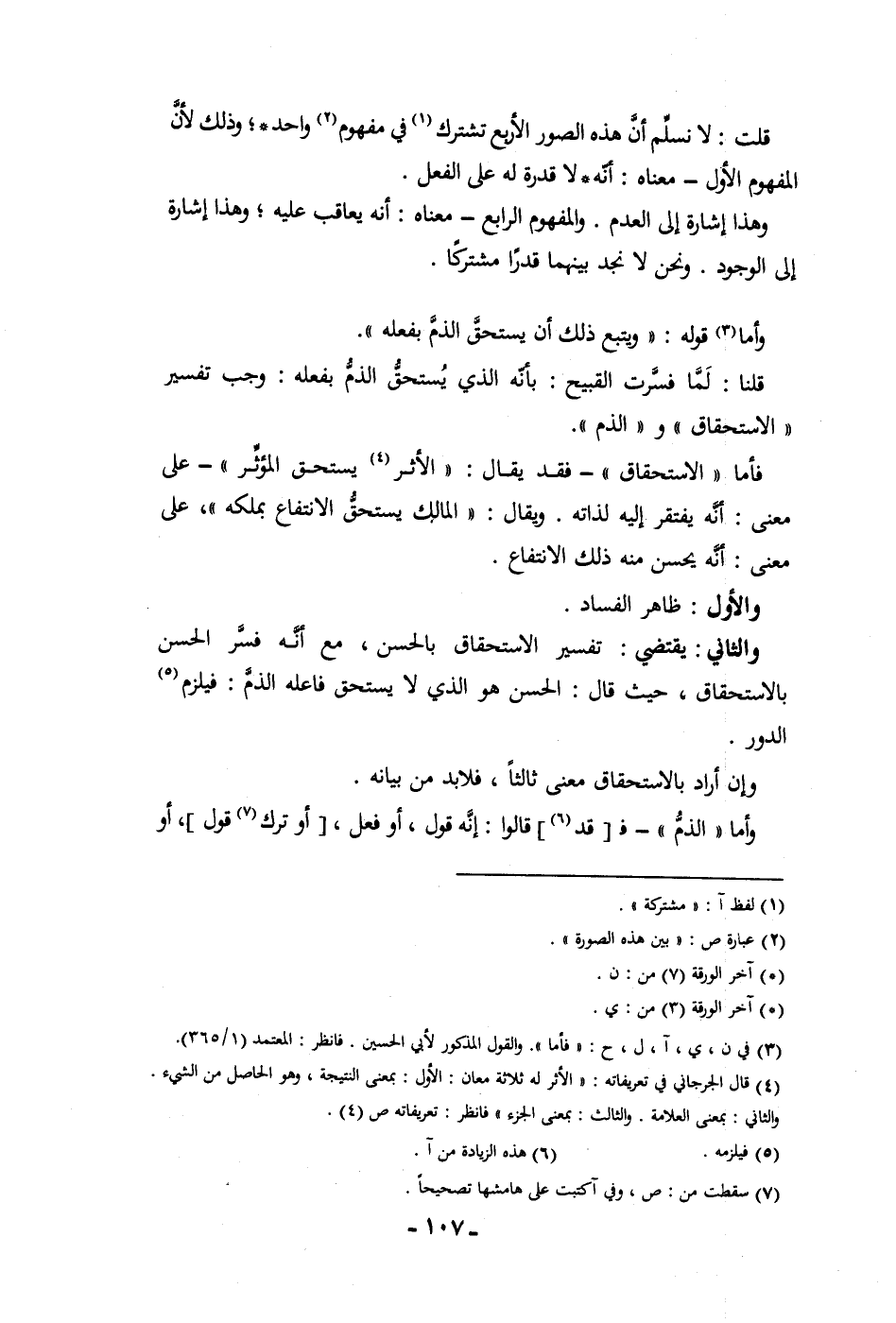 قلنا لما فسرت القبيح بأنه الذي يستحق الذم بفعله وجب تفسير الاستحقاق والذم فأما الاستحقاق فقد يقال الأثر يستحق المؤثر على معنى أنه يفتقر إليه لذاته ويقال المالك يستحق الانتفاع بملكه على معنى أنه يحسن منه ذلك الانتفاع والأول ظاهر الفساد والثاني يقتضي تفسير الاستحقاق بالحسن مع أنه فسر الحسن بالاستحقاق حيث قال الحسن هو الذي لا يستحق فاعله الذم فيلزم الدور وإن أراد بالاستحقاق معنى ثالثا فلا بد من بيانه وأما الذم فقد قالوا إنه قول أو فعل أو ترك قول أو