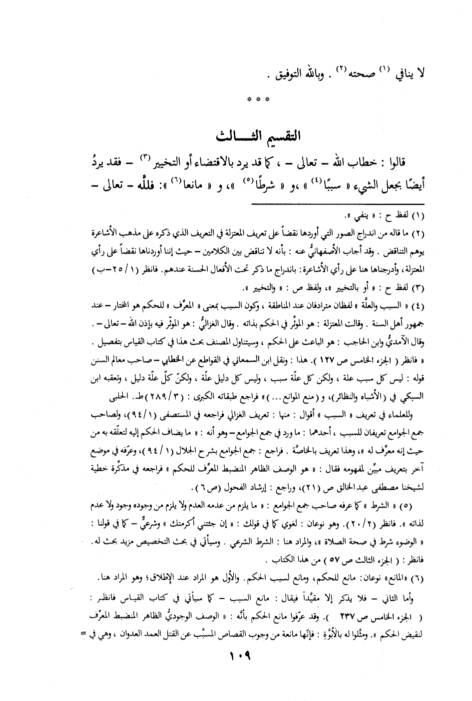 التقسيم الثالث قالوا خطاب الله تعالى كما قد يرد بالاقتضاء أو التخيير فقد يرد أيضا بجعل الشئ سببا وشرطا ومانعا فلله تعالى