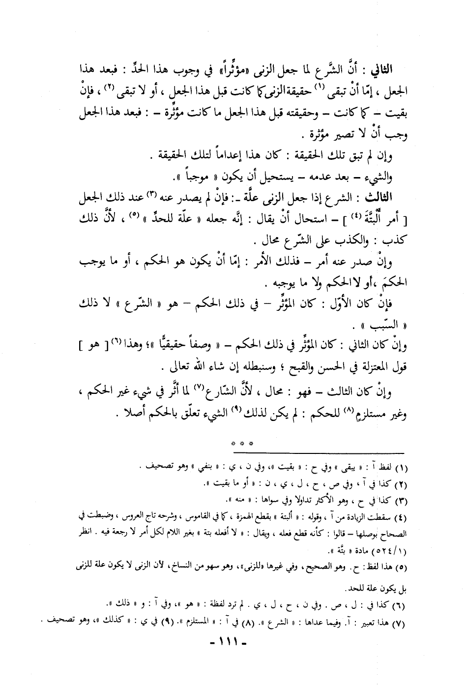 بقيت كما كانت وحقيقته قبل هذا الجعل ما كانت مؤثرة فبعد هذا الجعل وجب أن لا تصير مؤثرة وإن لم تبق تلك الحقيقة كان هذا إعداما لتلك الحقيقة والشئ بعد عدمه يستحيل أن يكون موجبا الثالث الشرع إذا جعل الزنا علة فإن لم يصدر عنه عند ذلك الجعل أمر ألبتة استحال أن يقال إنه جعله علة للحد لأن ذلك كذب والكذب على الشرع محال وإن صدر عنه أمر فذلك الأمر إما أن يكون هو الحكم أو ما يوجب الحكم أولا الحكم ولا ما يوجبه فإن كان الأول كان المؤثر في ذلك الحكم هو الشرع مع لا ذلك السبب وإن كان الثاني كان المؤثر في ذلك الحكم وصفا حقيقيا وهذا هو قول المعتزلة في الحسن والقبح وسنبطله إن شاء الله تعالى وإن كان الثالث فهو محال لأن الشارع لما أثر في شئ غير الحكم وغير مستلزم للحكم لم يكن لذلك الشئ تعلق بالحكم أصلا
