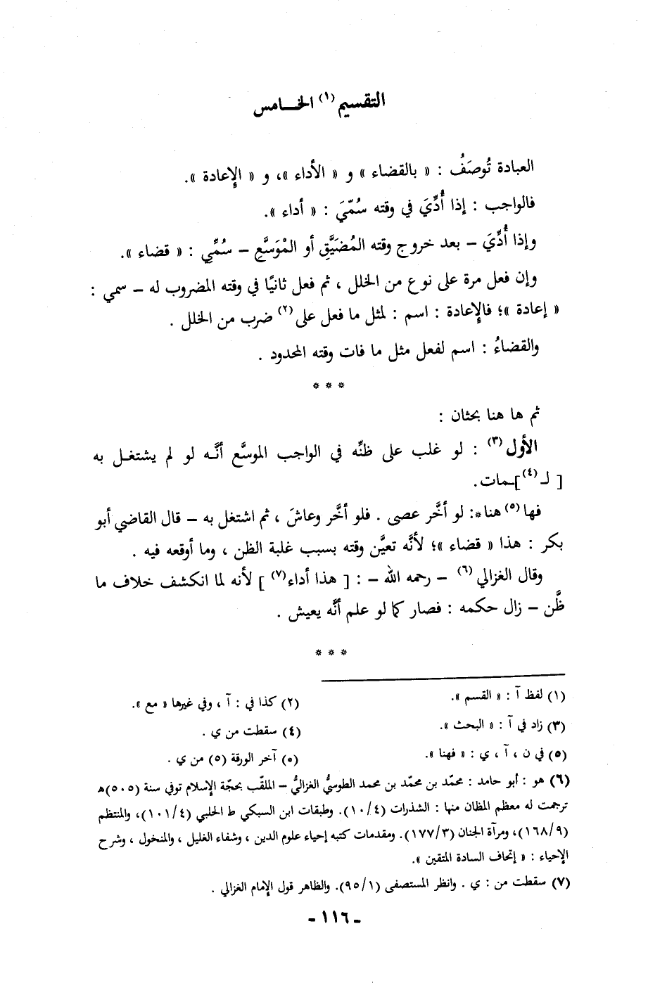 التقسيم الخامس العبادة توصف بالقضاء والأداء والإعادة فالواجب إذا أدي في وقته سمي أداء وإذا أدي بعد خروج وقته المضيق أو الموسع سمي قضاء وإن فعل مرة على نوع من الخلل ثم فعل ثانيا في وقته المضروب له سمي إعادة فالإعادة اسم لمثل ما فعل على ضرب من الخلل والقضاء اسم لفعل مثل ما فات وقته المحدود ثم ها هنا بحثان الأول لو غلب على ظنه في الواجب الموسع أنه لو لم يشتغل به لمات فها هنا لو أخر عصى فلو أخر وعاش ثم اشتغل به قال القاضي أبو بكر هذا قضاء لأنه تعين وقته بسبب غلبة الظن وما أوقعه فيه وقال الغزالي رحمه الله هذا أداء لأنه لما انكشف خلاف ما