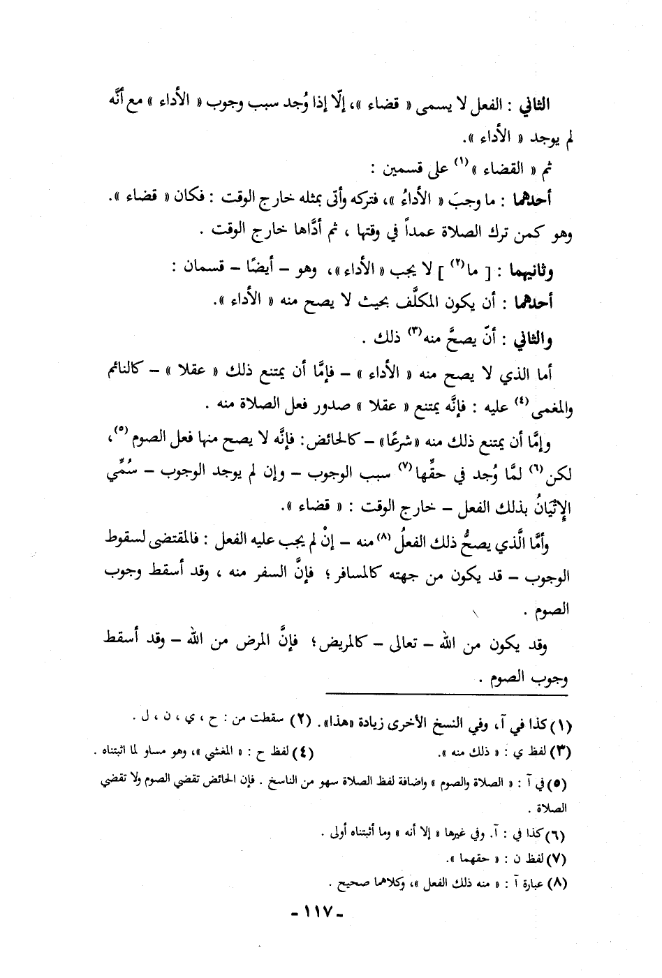 الثاني الفعل لا يسمى قضاء إلا إذا وجد سبب وجوب الأداء مع أنه لم يوجد الأداء ثم القضاء على قسمين أحدهما ما وجب الأداء فتركه وأتى بمثله خارج الوقت فكان قضاء وهو كمن ترك الصلاة عمدا في وقتها ثم أداها خارج الوقت وثانيهما ما لا يجب الأداء وهو أيضا قسمان أحدهما أن يكون المكلف بحيث لا يصح منه الأداء والثاني أن يصح منه ذلك أما الذي لا يصح منه الأداء فإما أن يمتنع ذلك عقلا كالنائم والمغمى عليه فإنه يمتنع عقلا صدور فعل الصلاة منه وإما أن يمتنع ذلك منه شرعا كالحائض فإنه لا يصح منها فعل الصوم لكن لما وجد في حقها سبب الوجوب وإن لم يوجد الوجوب سمي الإتيان بذلك الفعل خارج الوقت قضاء وأما الذي يصح ذلك الفعل منه إن لم يجب عليه الفعل فالمقتضى لسقوط الوجوب قد يكون من جهته كالمسافر فإن السفر منه وقد أسقط وجوب الصوم وقد يكون من الله تعالى كالمريض فإن المرض من الله وقد أسقط وجوب الصوم