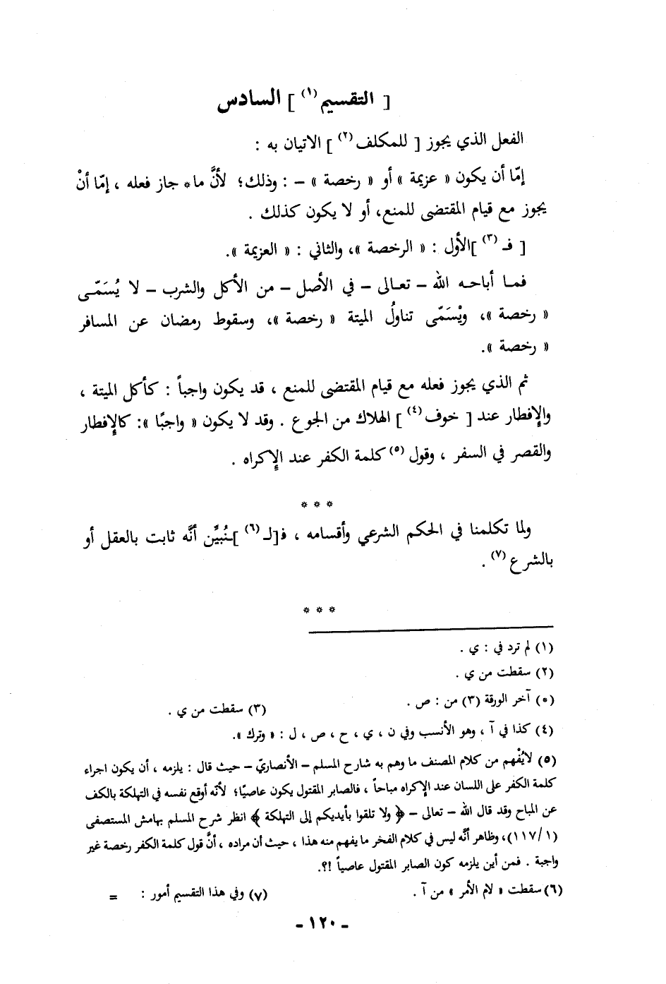 التقسيم السادس الفعل الذي يجوز للمكلف الإتيان به إما أن يكون عزيمة أو رخصة وذلك لأن ما جاز فعله إما أن يجوز مع قيام المقتضى للمنع أو لا يكون كذلك فالأول الرخصة والثاني العزيمة فما أباحه الله تعالى في الأصل من الأكل والشرب لا يسمى رخصة ويسمى تناول الميتة رخصة وسقوط رمضان عن المسافر رخصة ثم الذي يجوز فعله مع قيام المقتضى للمنع قد يكون واجبا كأكل الميتة والافطار عند خوف الهلاك من الجوع وقد لا يكون واجبا كالافطار والقصر في السفر وقول كلمة الكفر عند الإكراه ولما تكلمنا في الحكم الشرعي وأقسامه فلنبين أنه ثابت بالعقل أو بالشرع