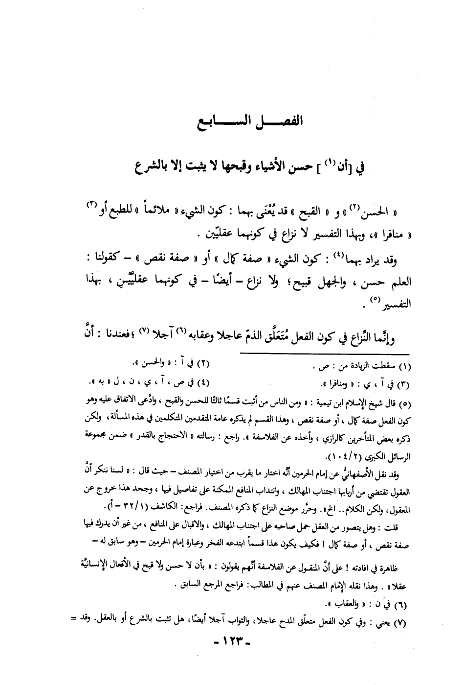 الفصل السابع في أن حسن الأشياء وقبحها لا يثبت إلا بالشرع الحسن والقبح قد يعنى بهما كون الشئ ملائما للطبع أو منافرا وبهذا التفسير لا نزاع في كونهما عقليين