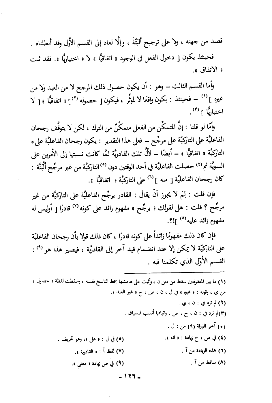 غيره فحينئذ يكون واقعا لا لمؤثر فيكون حصوله اتفاقيا لا اختياريا وأما لو قلنا إن المتمكن من الفعل متمكن من الترك لكن لا يتوقف رجحان الفاعلية على التاركية على مرجح فعلى هذا التقدير يكون رجحان الفاعلية على التاركية اتفاقيا أيضا لأن تلك القادرية لما كانت نسبتها إلى الأمرين على السوية ثم حصلت الفاعلية في أحد الوقتين دون التاركية من غير مرجح ألبتة كان رجحان الفاعلية منه على التاركية اتفاقيا فإن قلت لم لا يجوز أن يقال القادر يرجح الفاعلية على التاركية من غير مرجح قلت هل لقولك يرجح مفهوم زائد على كونه قادرا أو ليس له مفهوم زائد عليه فإن كان ذلك مفهوما زائدا على كونه قادرا كان ذلك قولا بأن رجحان الفاعلية على التاركية لا يمكن إلا عند انضمام قيد آخر إلى القادرية فيصير هذا هو القسم الأول الذي تكلمنا فيه