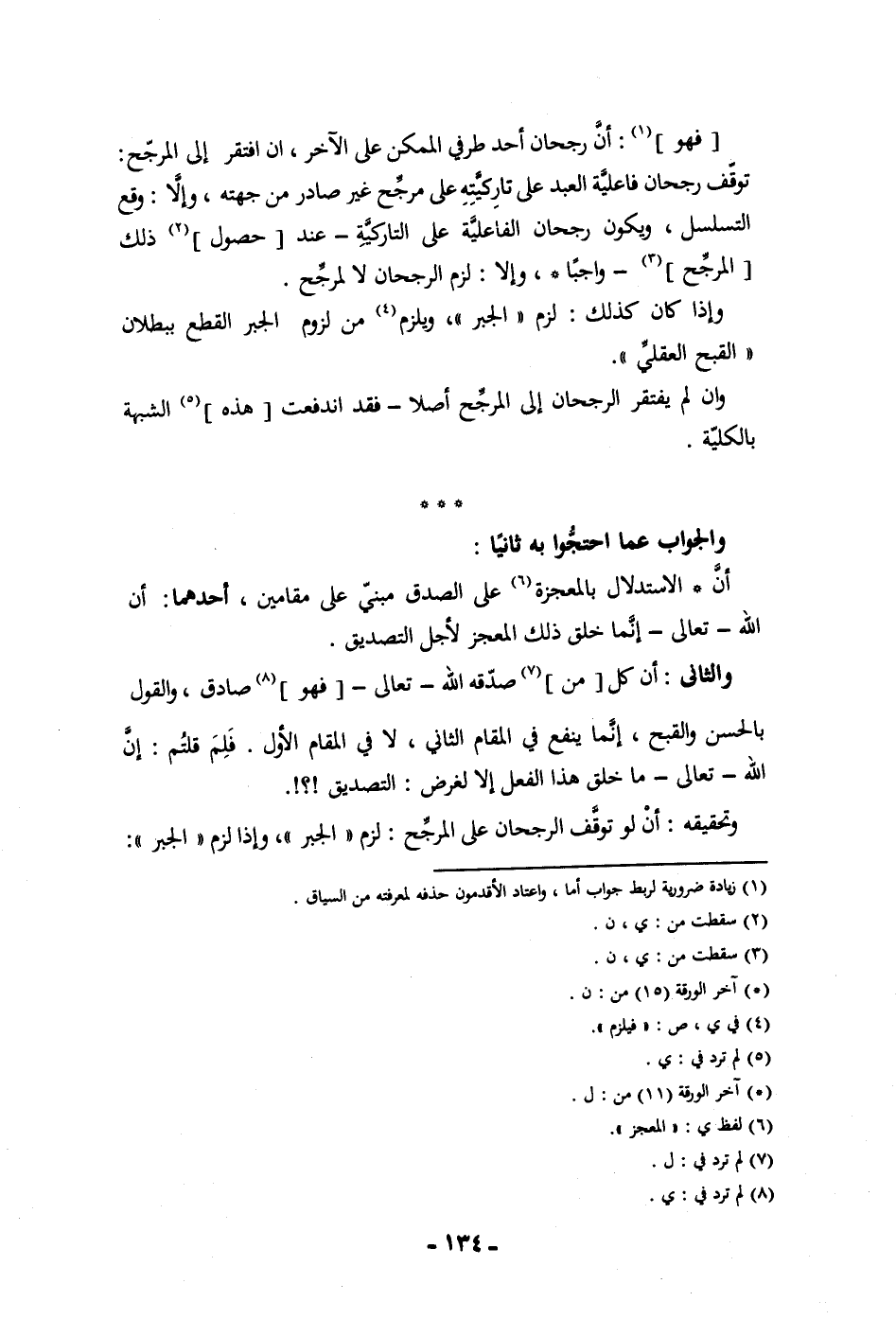 توقف رجحان فاعلية العبد على تاركيته على مرجح غير صادر من جهته وإلا وقع التسلسل ويكون رجحان الفاعلية على التاركية عند حصول ذلك المرجح واجبا وإلا لزم الرجحان لا لمرجح وإذا كان كذلك لزم الجبر ويلزم من لزوم الجبر القطع ببطلان القبح العقلي وإن لم يفتقر الرجحان إلى المرجح أصلا فقد اندفعت هذه الشبهة بالكلية والجواب عما احتجوا به ثانيا أن الاستدلال بالمعجزة على الصدق مبني على مقامين أحدهما أن الله تعالى إنما خلق ذلك المعجز لأجل التصديق والثاني أن كل من صدقه الله تعالى فهو صادق والقول بالحسن والقبح إنما ينفع في المقام الثاني لا في المقام الأول فلم قلتم إن الله تعالى ما خلق هذا الفعل إلا لغرض التصديق وتحقيقه أن لو توقف الرجحان على المرجح لزم الجبر وإذا لزم الجبر