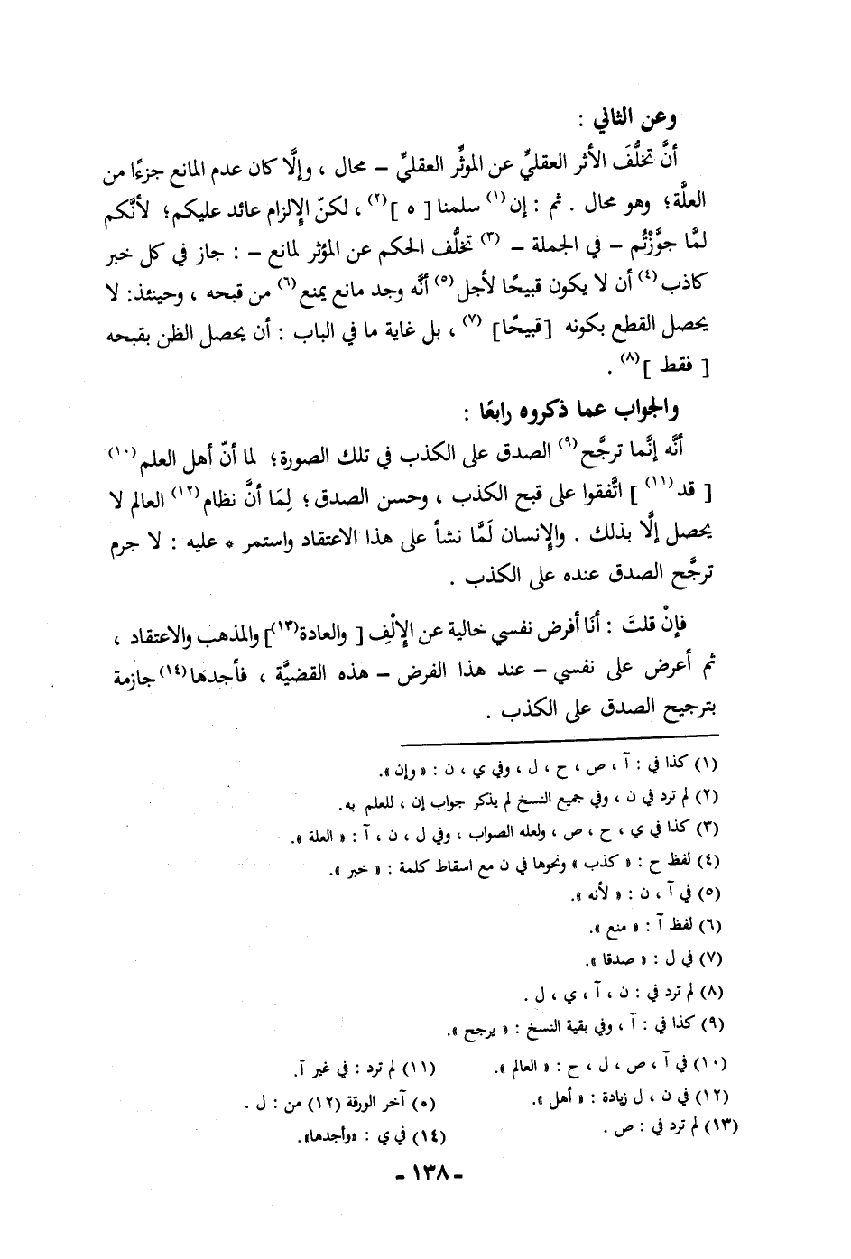 وعن الثاني أن تخلف الأثر العقلي عن المؤثر العقلي محال وإلا كان عدم المانع جزءا من العلة وهو محال ثم إن سلمناه لكن الإلزام عائد عليكم لأنكم لما جوزتم في الجملة تخلف الحكم عن المؤثر لمانع جاز في كل خبر كاذب أن لا يكون قبيحا لأجل أنه وجد مانع يمنع من قبحه وحينئذ لا