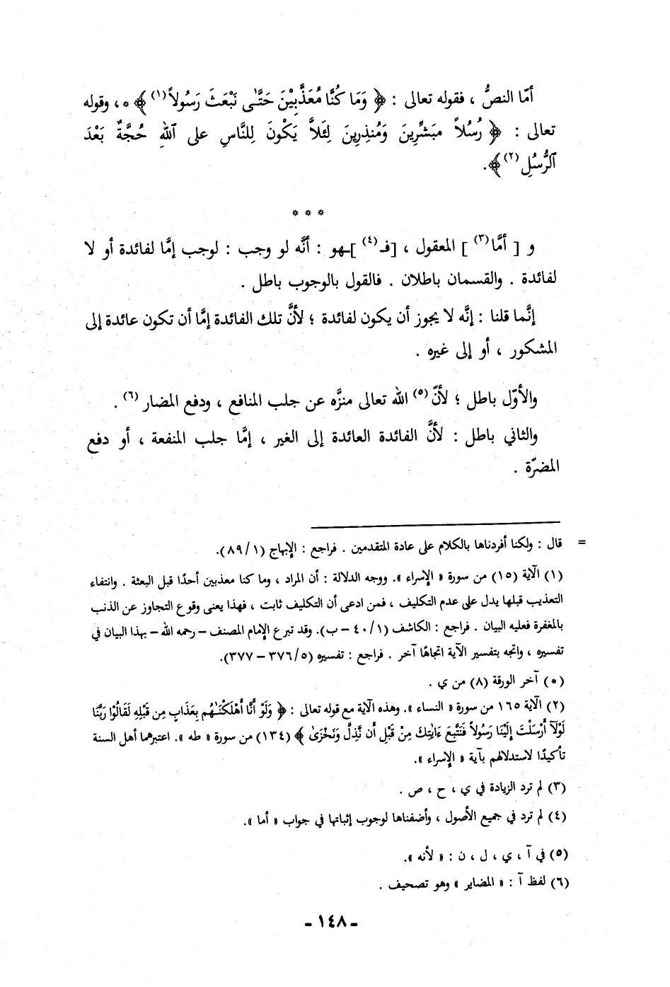 أما النص فقوله تعالى وما كنا معذبين حتى نبعث رسولا وقوله تعالى رسلا مبشرين ومنذرين لئلا يكون للناس على الله حجة بعد الرسل وأما المعقول فهو أنه لو وجب لوجب إما لفائدة أو لا لفائدة والقسمان باطلان فالقول بالوجوب باطل إنما قلنا إنه لا يجوز أن يكون لفائدة لأن تلك الفائدة إما أن تكون عائدة إلى المشكور أو إلى غيره والأول باطل لأن الله تعالى منزه عن جلب المنافع ودفع المضار والثاني باطل لأن الفائدة العائدة إلى الغير إما جلب المنفعة أو دفع