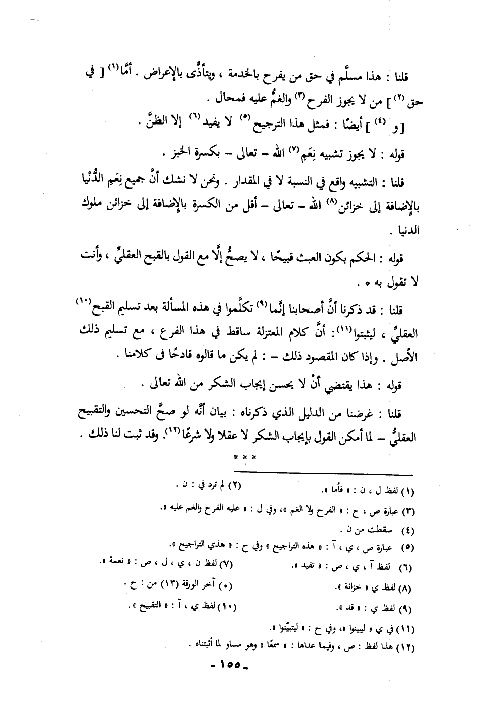 قلنا هذا مسلم في حق من يفرح بالخدمة ويتأذى بالإعراض أما في حق من لا يجوز الفرح والغم عليه فمحال وأيضا فمثل هذا الترجيح لا يفيد إلا الظن قوله لا يجوز تشبيه نعم الله تعالى بكسرة الخبز قلنا التشبيه واقع في النسبة لا في المقدار ونحن لا نشك أن جميع نعم الدنيا بالإضافة إلى خزائن الله تعالى أقل من الكسرة بالإضافة إلى ملوك الدنيا قوله الحكم بكون العبث قبيحا لا يصح إلا مع القول بالقبح العقلي وأنت لا تقول به قلنا قد ذكرنا أصحابنا إنما تكلموا في هذه المسألة بعد تسليم القبح العقلي ليثبتوا أن كلام المعتزلة ساقط في هذا الفرع مع تسليم ذلك الأصل وإذا كان المقصود ذلك لم يكن ما قالوه قادحا في كلامنا قوله هذا يقتضي أن لا يحسن ايجاب الشكر من الله تعالى قلنا غرضنا من الدليل الذي ذكرناه بيان أنه لو صح التحسين والتقبيح العقلي لما أمكن القول بايجاب الشكر لا عقلا ولا شرعا وقد ثبت لنا ذلك