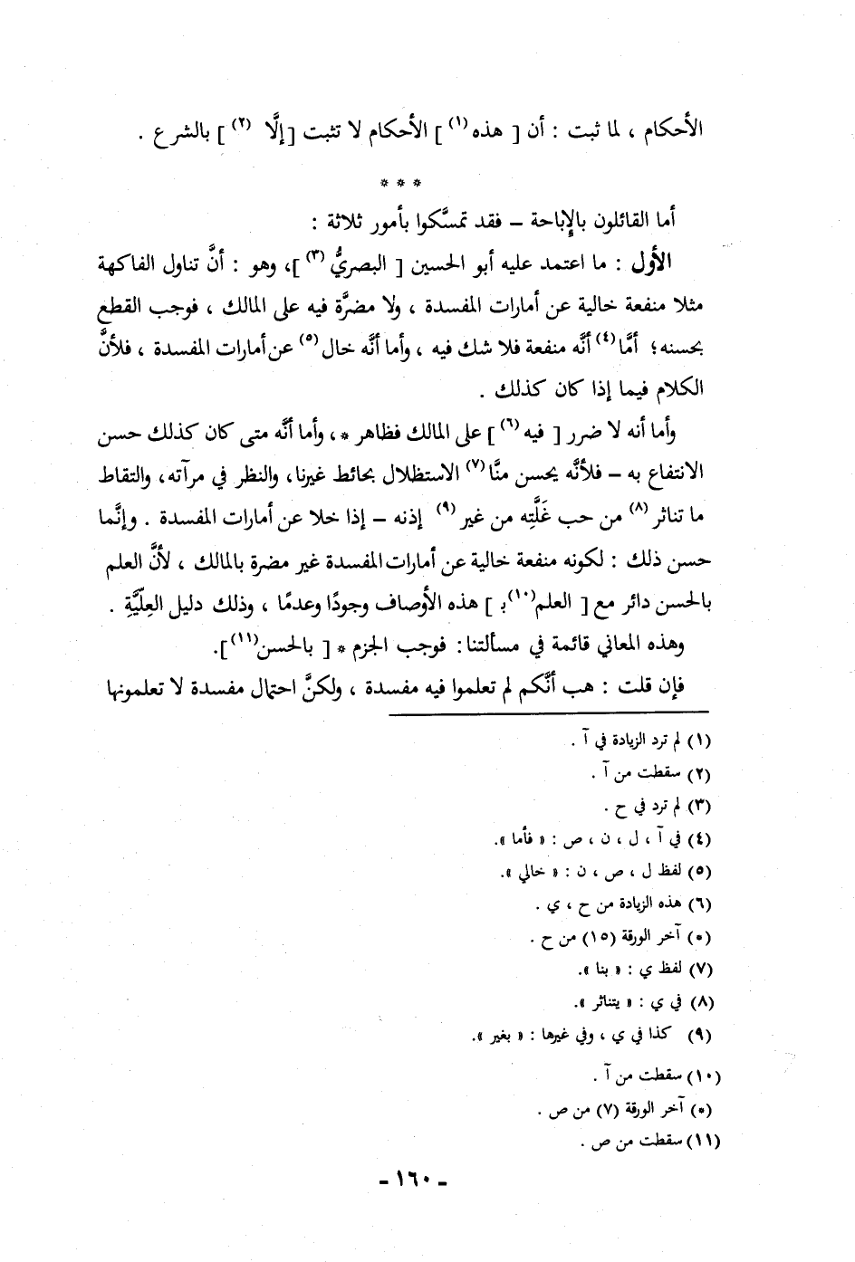 الأحكام لما ثبت أن هذه الأحكام لا تثبت إلا بالشرع أما القائلون بالاباحة فقد تمسكوا بأمور ثلاثة الأول ما اعتمد عليه أبو الحسين البصري وهو أن تناول الفاكهة مثلا منفعة خالية عن أمارات المفسدة ولا مضرة فيه على المالك فوجب القطع بحسنه أما أنه منفعة فلا شك فيه وأما أنه خال عن أمارات المفسدة فلأن الكلام فيما إذا كان كذلك وأما أنه لا ضرر فيه على المالك فظاهر وأما أنه متى كان كذلك حسن الانتفاع به فلأنه يحسن منا الاستظلال بحائط غيرنا والنظر في مرآته والتقاط ما تناثر من حب غلته من غير إذنه إذا خلا عن أمارات المفسدة وإنما حسن ذلك لكونه منفعة خالية عن أمارات المفسدة غير مضرة بالمالك لأن العلم بالحسن دائر مع العلم بهذه الأوصاف وجودا وعدما وذلك دليل العلية وهذه المعاني قائمة في مسألتنا فوجد الجزم بالحسن