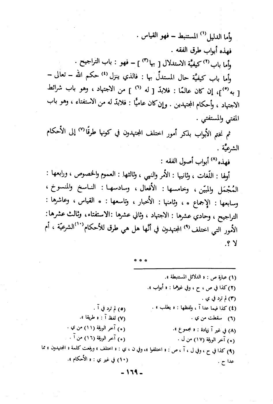 وأما الدليل المستنبط فهو القياس فهذه أبواب طرق الفقه وأما باب كيفية الاستدلال بها فهو باب التراجيح وأما باب كيفية حال المستدل بها فالذي ينزل حكم الله تعالى به إن كان عالما فلا بد له من الاجتهاد وهو باب شرائط الاجتهاد وأحكام المجتهدين وإن كان عاميا فلا بد له من الاستفتاء وهو باب المفتي والمستفتي ثم نختم الأبواب بذكر أمور اختلف المجتهدون في كونها طرقا إلى الأحكام الشرعية فهذه أبواب أصول الفقه أولها اللغات وثانيها الأمر والنهي وثالثها العموم والخصوص ورابعها المجمل والمبين وخامسها الأفعال وسادسها الناسخ والمنسوخ