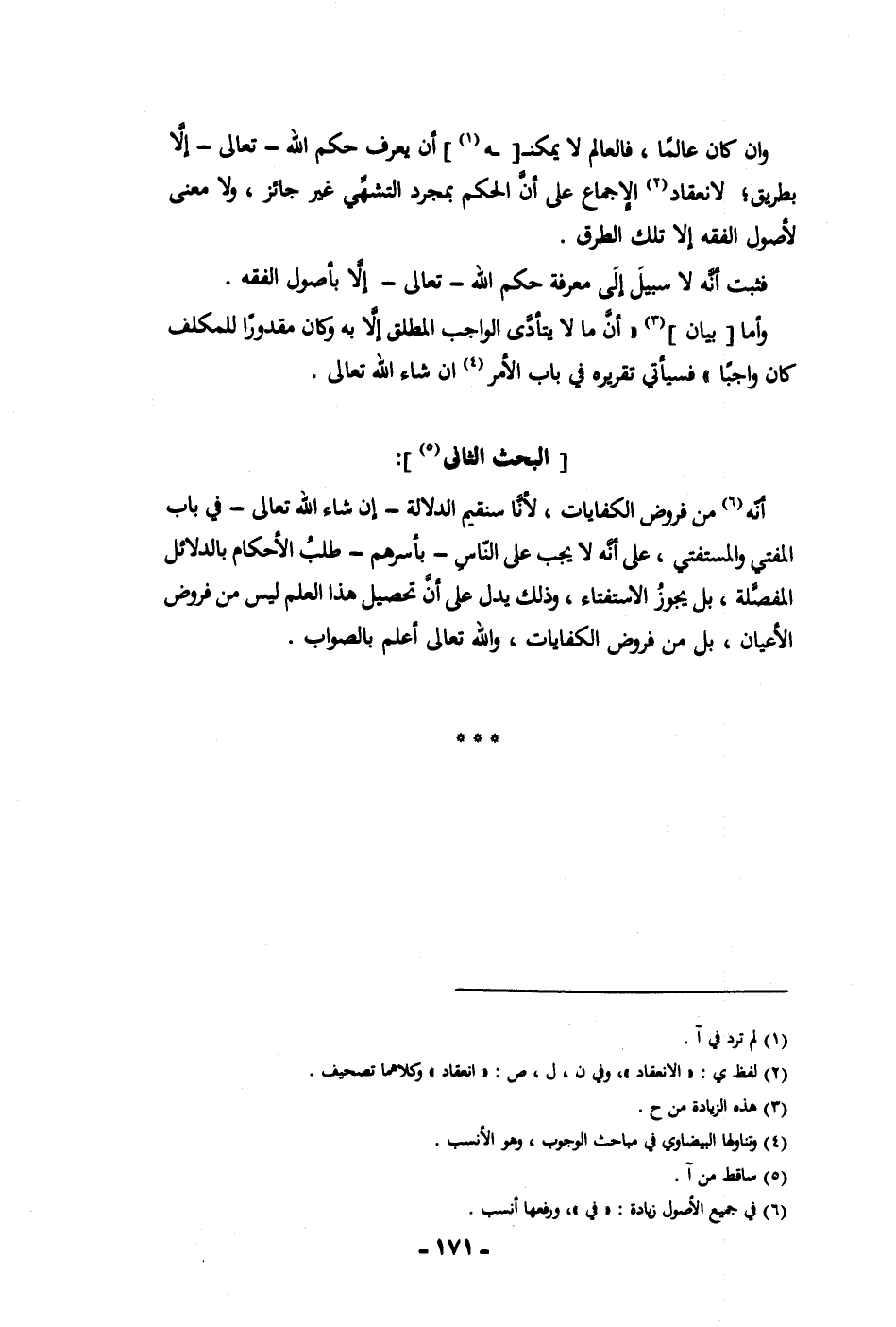 بطريق لانعقاد الإجماع على أن الحكم بمجرد التشهي غير جائز ولا معنى لأصول الفقه إلا تلك الطرق فثبت أنه لا سبيل إلى معرفة حكم الله تعالى إلا بأصول الفقه وأما بيان أن ما لا يتأدى الواجب المطلق إلا به وكان مقدورا للمكلف كان واجبا فسيأتي تقريره في باب الأمر إن شاء الله تعالى البحث الثاني أنه من فروض الكفايات لأنا سنقيم الدلالة إن شاء الله تعالى في باب المفتي والمستفتي على أنه لا يجب على الناس بأسرهم طلب الأحكام بالدلائل المفصلة بل يجوز الاستفتاء وذلك يدل على أن تحصيل هذا العلم ليس من فروض الأعيان بل من فروض الكفايات والله تعالى أعلم بالصواب