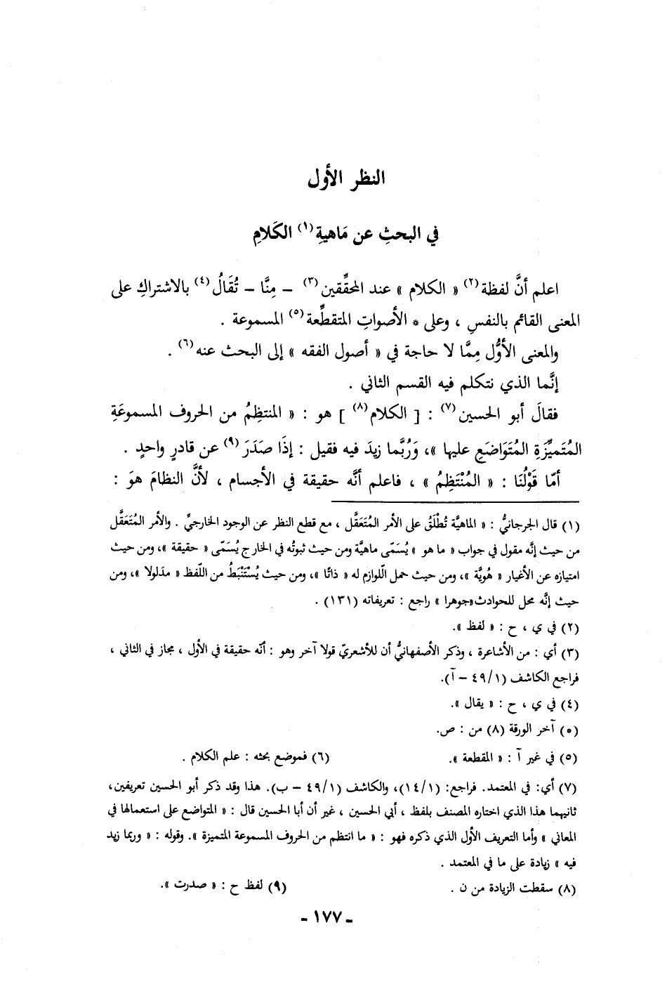 اعلم أن لفظة الكلام عند المحققين منا تقال بالاشتراك على المعنى القائم بالنفس وعلى الأصوات المتقطعة المسموعة والمعنى الأول مما لا حاجة في أصول الفقه إلى البحث عنه إنما الذي نتكلم فيه القسم الثاني فقال أبو الحسين الكلام هو المنتظم من الحروف المسموعة المتميزة المتواضع عليها وربما زيد فيه فقيل إذا صدر عن قادر واحد أما قولنا المنتظم فاعلم أنه حقيقة في الأجسام لأن النظام هو