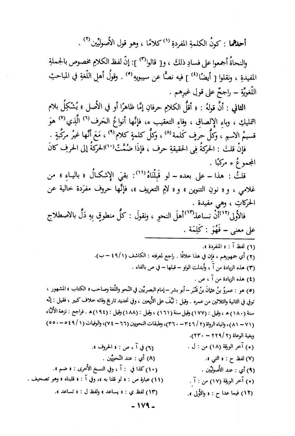 أحدهما كون الكلمة المفردة كلاما وهو قول الأصوليين والنحاة أجمعوا على فساد ذلك وقالوا إن لفظ الكلام مخصوص بالجملة المفيدة ونقلوا أيضا فيه نصا عن سيبويه وقول أهل اللغة في المباحث اللغوية راجح على قول غيرهم الثاني أن قوله أقل الكلام حرفان إما ظاهرا أو في الأصل يشكل بلام التمليك وباء الالصاق وفاء التعقيب فإنها أنواع الحرف الذي هو قسيم الاسم وكل حرف كلمة وكل كلمة كلام مع أنها غير مركبة فإن قلت الحركة في الحقيقة حرف فإذا ضمت الحركة إلى الحرف كان المجموع مركبا قلت هذا على بعده لو قبلناه بقي الإشكال بالياء من غلامي ونون التنوين ولام التعريف فإنها حروف مفردة خالية عن الحركات وهي مفيدة فالأولى أن نساعد أهل النحو ونقول كل منطوق به دل بالاصطلاح على معنى فهو كلمة