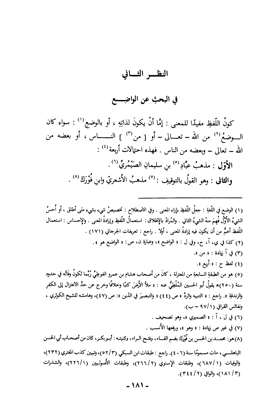 النظر الثاني في البحث عن الواضع كون اللفظ مفيدا للمعنى إما أن يكون لذاته أو بالوضع سواء كان الوضع من الله تعالى أو من الناس أو بعضه من الله تعالى وبعضه من الناس فهذه احتمالات أربعة الأول مذهب عباد بن سليمان الصيمري والثاني وهو القول بالتوقيف مذهب الأشعري وابن فورك