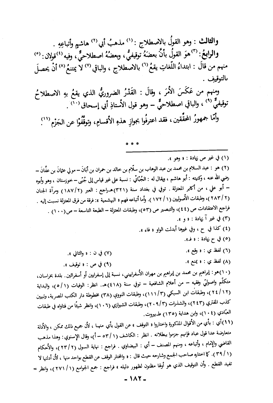 والثالث وهو القول بالاصطلاح مذهب أبي هاشم وأتباعه والرابع هو القول بأن بعضه توقيفي وبعضه اصطلاحي وفيه قولان منهم من قال ابتداء اللغات يقع بالاصطلاح والباقي لا يمتنع أن يحصل بالتوقيف ومنهم من عكس الأمر وقال القدر الضروري الذي يقع به الاصطلاحي توقيفي والباقي اصطلاحي وهو قول الأستاذ أبي اسحاق وأما جمهور المحققين فقد اعترفوا بجواز هذه الأقسام وتوقفوا عن الجزم