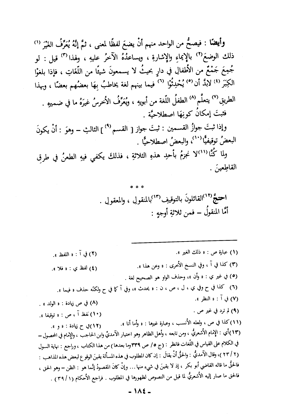 الكبر لا بد وأن يحدثوا فيما بينهم لغة يخاطب بها بعضهم بعضا وبهذا الطريق يتعلم الطفل اللغة من أبويه ويعرف الأخرس غيره ما في ضميره فثبت إمكان كونها اصطلاحية واذا ثبت جواز القسمين ثبت جواز القسم الثالث وهو أن يكون البعض توقيفيا والبعض اصطلاحيا ولما كنا لا نجزم بأحد هذه الثلاثة فذلك يكفي فيه الطعن في طرق القاطعين احتج القائلون بالتوقيف بالمنقول والمعقول أما المنقول فمن ثلاثة أوجه