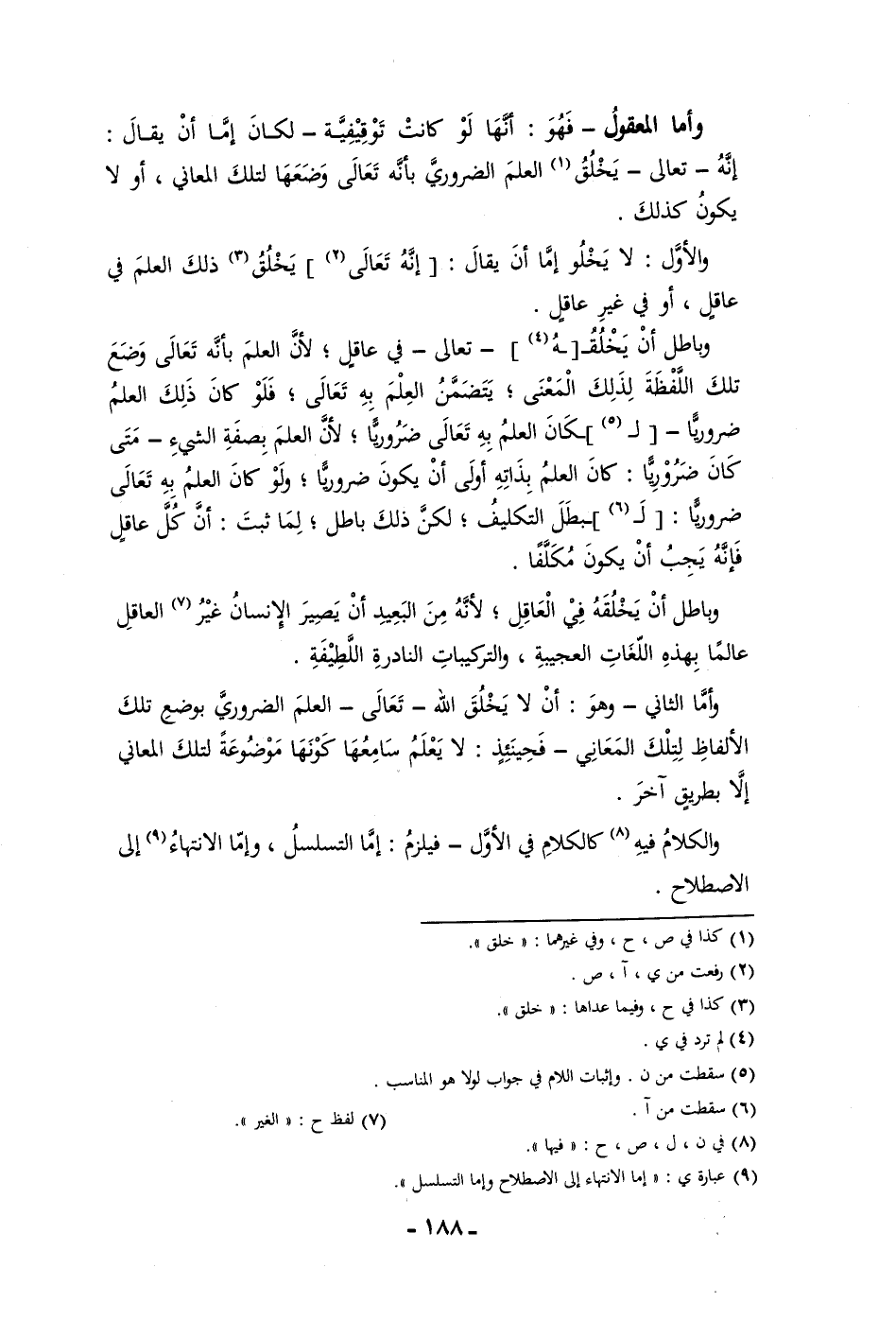 وأما المعقول فهو أنها لو كانت توقيفية لكان إما أن يقال إنه تعالى يخلق العلم الضروري بأنه تعالى وضعها لتلك المعاني أو لا يكون كذلك والأول لا يخلو إما ان يقال إنه تعالى يخلق ذلك العلم في العاقل أو في غير عاقل وباطل أن يخلقه تعالى في عاقل لأن العلم بأنه تعالى وضع تلك اللفظة لذلك المعنى يتضمن العلم به تعالى فلو كان ذلك العلم ضروريا لكان العلم به تعالى ضروريا لأن العلم بصفة الشئ متى كان ضروريا كان العلم بذاته أولي أن يكون ضروريا ولو كان العلم به تعالى ضروريا لبطل التكليف لكن ذلك باطل لما ثبت أن كل عاقل فإنه يجب أن يكون مكلفا وباطل أن يخلقه في العاقل لأنه من البعيد أن يصير الانسان غير العاقل عالما بهذه اللغات العجيبة والتركيبات النادرة اللطيفة وأما الثاني وهو أن لا يخلق الله تعالى العلم الضروري بوضع تلك الألفاظ لتلك المعاني فحينئذ لا يعلم سامعها كونها موضوعة لتلك المعاني إلى بطريق آخر والكلام فيه كالكلام في الأول فيلزم إما التسلسل وإما الانتهاء إلى الاصطلاح
