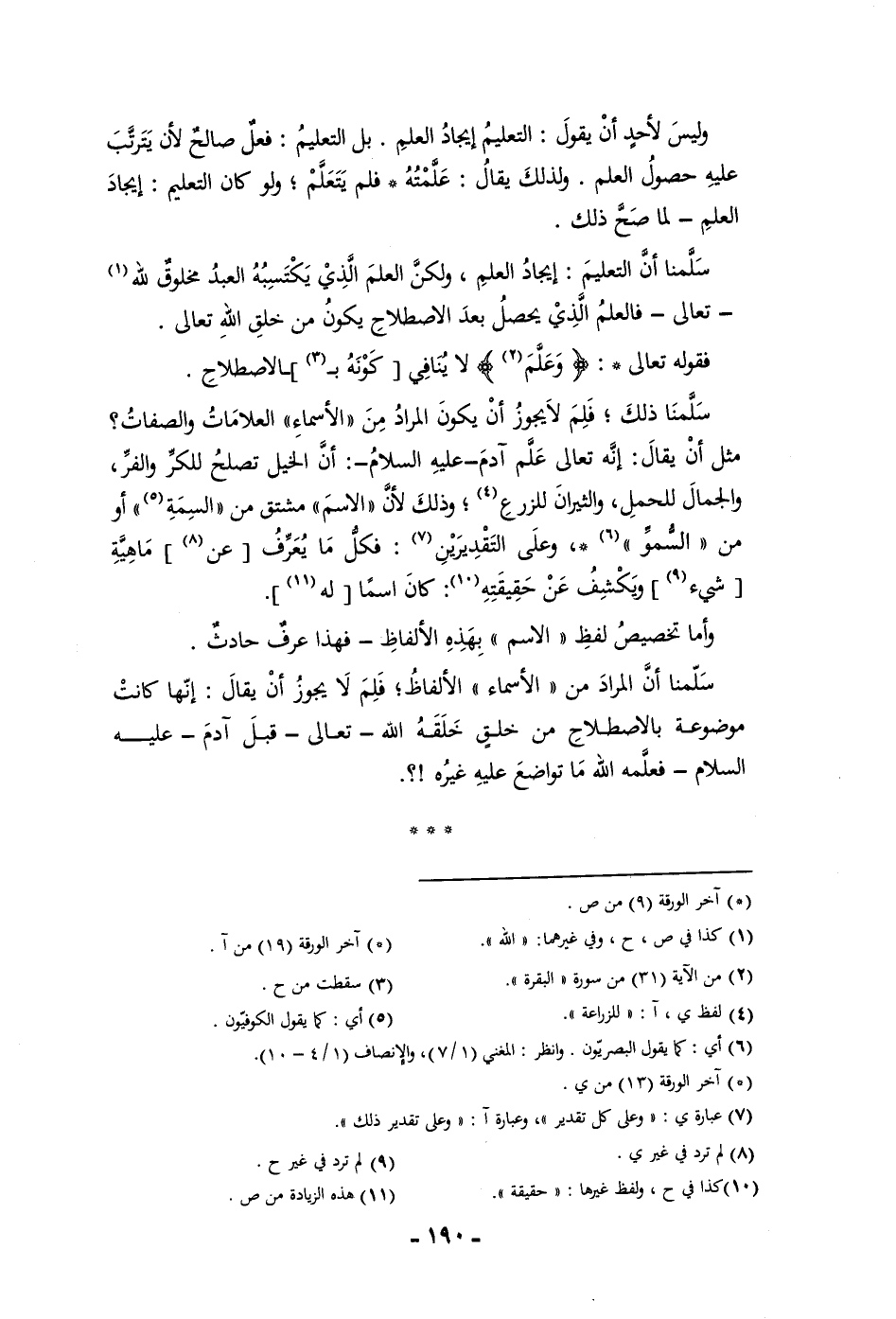 وليس لأحد أن يقول التعليم ايجاد العلم بل التعليم فعل صالح لأن يترتب عليه حصول العلم ولذلك يقال علمته فلم يتعلم ولو كان التعليم ايجاد العلم لما صح ذلك سلمنا أن التعليم ايجاد العلم ولكن العلم الذي يكتسبه العبد مخلوق لله تعالى فالعلم الذي يحصل بعد الاصطلاح بكون من خلق الله تعالى فقوله تعالى وعلم ولا ينافي كونه بالاصطلاح سلمنا ذلك فلم لا يجوز أن يكون المراد من الأسماء العلامات والصفات مثل أن يقال إنه تعالى علم آدم عليه السلام أن الخيل تصلح للكر والفر والجمال للحمل والثيران للزرع وذلك لأن الاسم مشتق من السمة أو من السمو وعلى التقديرين فكل ما يعرف عن ماهية شئ ويكشف عن حقيقته كان اسما له وأما تخصيص لفظ الاسم بهذه الألفاظ فهذا عرف حادث