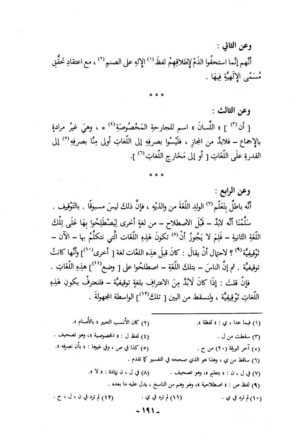 وعن الثاني أنهم إنما استحقوا الذم لاطلاقهم لفظ الإله على الصنم مع اعتقاد تحقق مسمى الإلهية فيها وعن الثالث أن اللسان اسم للجارحة المخصوصة وهي غير مرادة بالاجماع فلا بد من المجاز فليسوا بصرفه إلى اللغات أولى منا بصرفه إلى القدرة على اللغات أو إلى مخارج اللغات وعن الرابع أنه باطل بتعلم الولد اللغة من والديه فإن ذلك ليس مسبوقا بالتوقيف سلمنا أنه بعد لا بد قبل الاصطلاح من لغة أخرى ليصطلحوا بها على تلك اللغة الثانية فلم لا يجوز أن تكون هذه اللغات التي نتكلم بها الآن توقيفية لاحتمال أن يقال كان قبل هذه اللغات لغة أخرى وأنها كانت توقيفية ثم إن الناس بتلك اللغة اصطلحوا على وضع هذه اللغات فإن قلت إذا كان لا بد من الاعتراف بلغة توقيفية فلنعترف يقول بكون هذه اللغات توقيفية ولنسقط الذي من البين تلك الواسطة المجهولة
