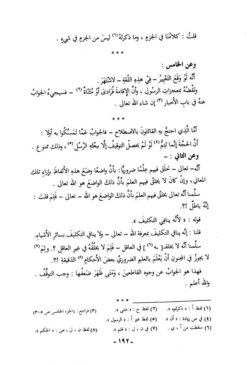 أنه لو وقع التغيير في هذه اللغة لاشتهر ونقضه بمعجزات الرسول وأن الإقامة فرادى أو مثناة فسيجئ الجواب عنه في باب الأخبار إن شاء الله تعالى أما الذي احتج به القائلون بالاصطلاح فالجواب عما تمسكوا به أولا أن الحجة إنما تتم لو لم يحصل التوقيف إلا ببعثة الرسل وذلك ممنوع وعن الثاني أنه تعالى خلق فيهم علما ضروريا بأن واضعا وضع هذه الألفاظ بازاء تلك المعاني وإن كان لا يخلق فيهم العلم بأن ذلك الواضع هو الله تعالى سلمنا أنه تعالى يخلق فيهم العلم بأن ذلك الواضع هو الله تعالى فلم قلت إنه باطل قوله لأنه ينافي التكليف قلنا إنه ينافي التكليف بمعرفة الله تعالى ولا ينافي التكليف بسائر الأشياء سلمنا أنه لا يخلقه في العاقل فلم لا يخلقه في غير العاقل ولم لا يجوز في المجنون أن يعلم بالعلم الضروري بعض الأحكام الدقيقة فهذا هو الجواب عن وجوه القاطعين ومتى ظهر ضعفها وجب التوقف والله أعلم