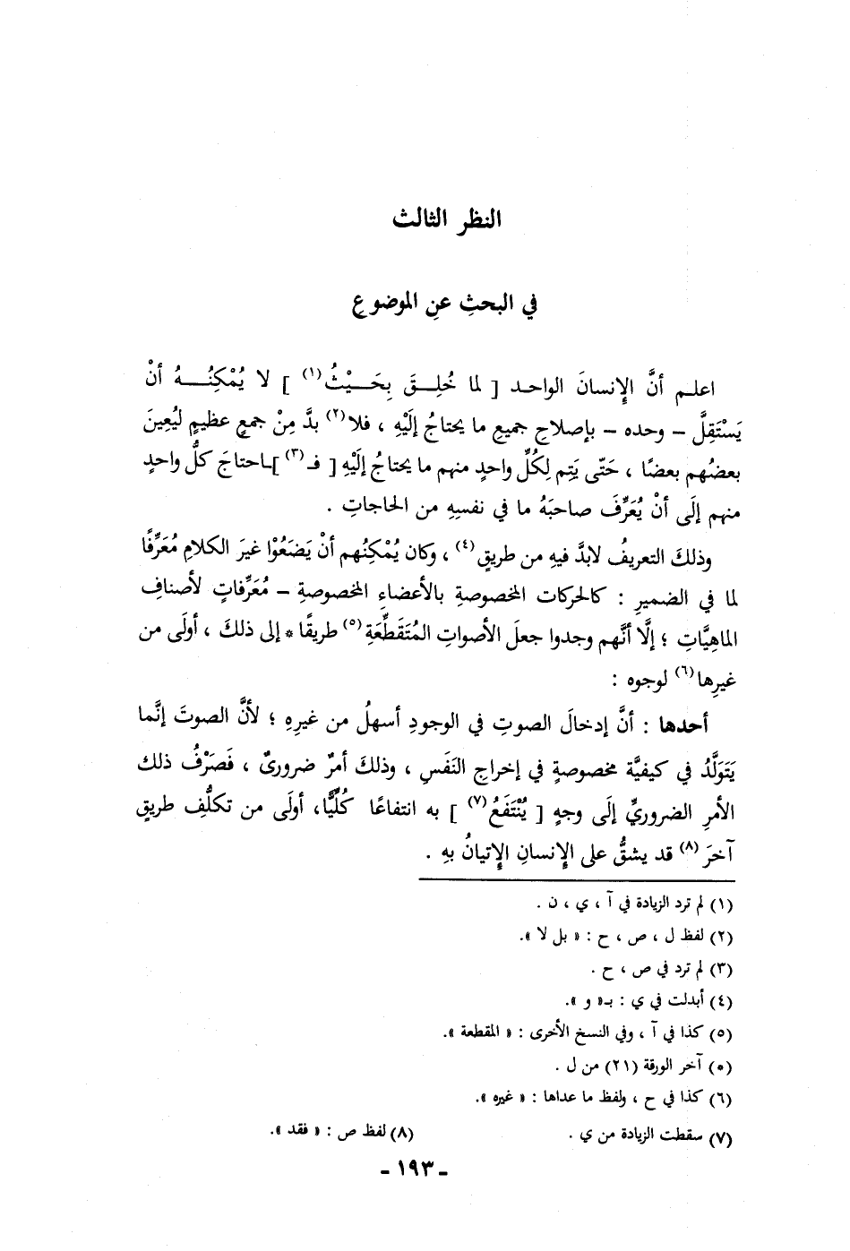 النظر الثالث في البحث عن الموضوع اعلم أن الانسان الواحد لما خلق بحيث لا يمكنه أن يستقل وحده باصلاح جميع ما يحتاج إليه فلا بد من جمع عظيم ليعين بعضهم بعضا حتى يتم لكل واحد منهم ما يحتاج إليه ف احتاج كل واحد