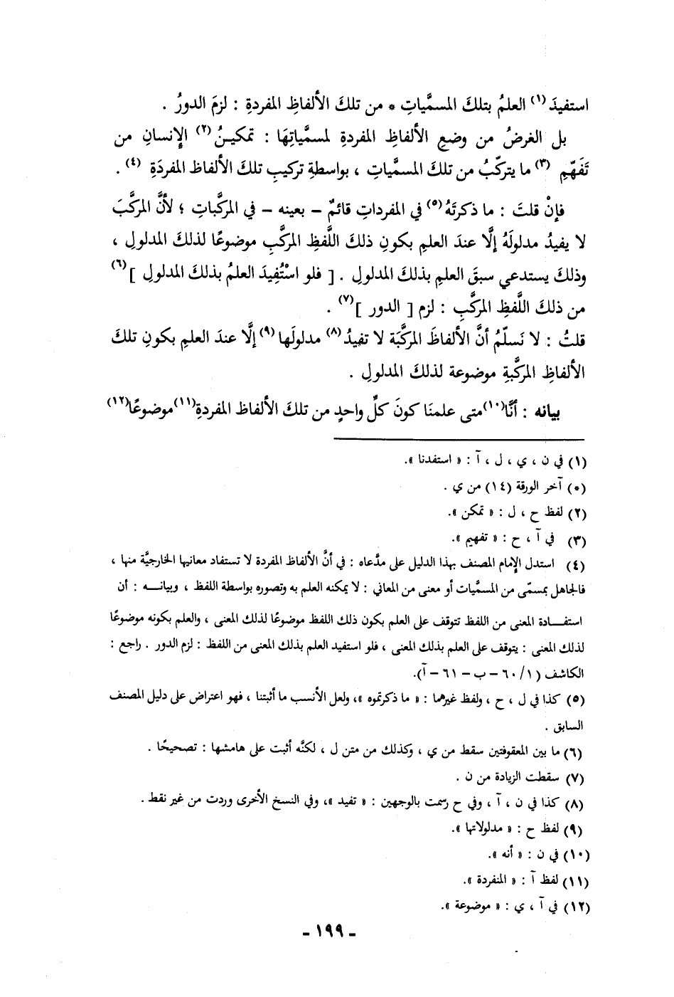 استفيد العلم بتلك المسميات من تلك الألفاظ المفردة لزم الدور بل الغرض من وضع الألفاظ المفردة لمسمياتها تمكين الانسان من تفهم ما يتركب من تلك المسميات بواسطة تركيب تلك الألفاظ المفردة فان قلت ما ذكرته في المفردات قائم بعينه في المركبات لأن المركب لا يفيد مدلوله إلا عند العلم بكون ذلك اللفظ المركب موضوعا لذلك المدلول وذلك يستدعي سبق العلم بذلك المدلول فلو استفيد العلم بذلك المدلول من ذلك اللفظ المركب لزم الدور قلت لا نسلم أن الألفاظ المركبة لا تفيد مدلولها إلا عند العلم بكون تلك الألفاظ المركبة موضوعة لذلك المدلول