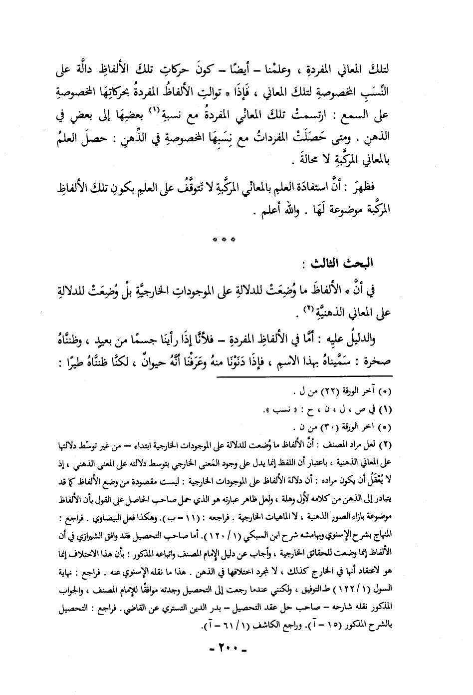لتلك المعاني المفردة وعلمنا أيضا كون حركات تلك الألفاظ دالة على النسب المخصوصة لتلك المعاني فاذا توالت الألفاظ المفردة بحركاتها المخصوصة على السمع ارتسمت تلك المعاني المفردة مع نسبة بعضها إلى بعض في الذهن ومتى حصلت المفردات مع نسبها المخصوصة في الذهن حصل العلم بالمعاني المركبة لا محالة فظهر أن استفادة العلم بالمعاني المركبة لا تتوقف على العلم بكون تلك الألفاظ المركبة موضوعة لها والله أعلم البحث الثالث في أن الألفاظ ما وضعت للدلالة على الموجودات الخارجية بل وضعت للدلالة على المعاني الذهنية والدليل عليه أما في الألفاظ المفردة فلأنا إذا رأينا جسما من بعيد وظنناه صخرة سميناه بهذا الاسم فإذا دنونا منه وعرفنا أنه حيوان لكنا ظنناه طيرا