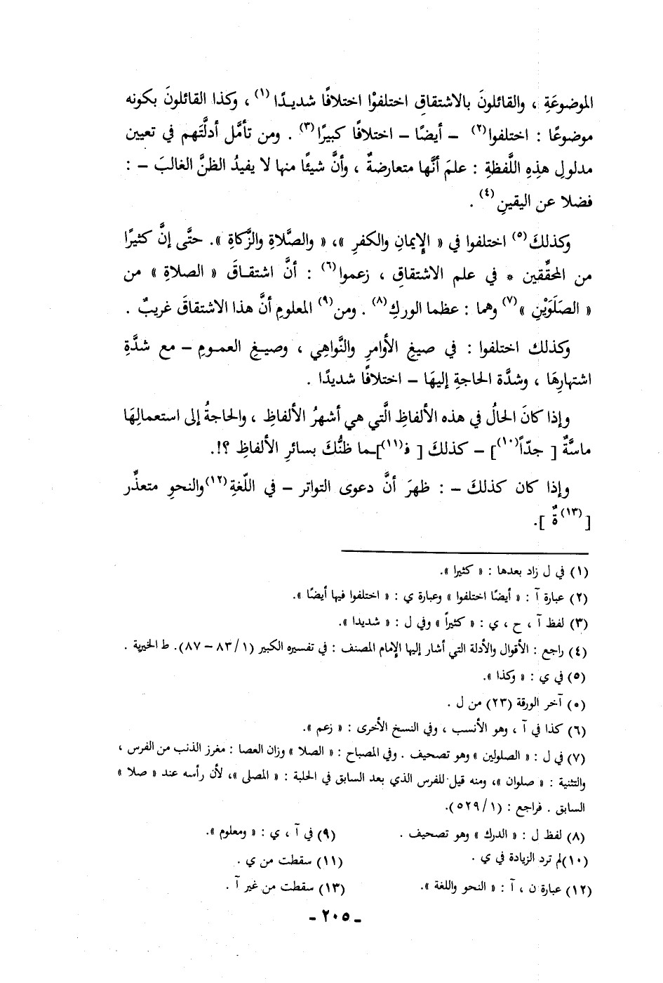 الموضوعة والقائلون بالاشتقاق اختلفوا اختلافا شديدا وكذا القائلون بكونه موضوعا اختلفوا أيضا اختلافا كبيرا ومن تأمل أدلتهم في تعيين مدلول هذه اللفظة علم أنها متعارضة وأن شيئا منها لا يفيد الظن الغالب فضلا عن اليقين وكذلك اختلفوا في الايمان والكفر والصلاة والزكاة حتى إن كثيرا من المحققين في علم الاشتقاق زعموا أن اشتقاق الصلاة من الصلوين وهما عظما الورك ومن المعلوم أن هذا الاشتقاق غريب وكذلك اختلفوا في صيغ الأوامر والنواهي وصيغ العموم مع شدة