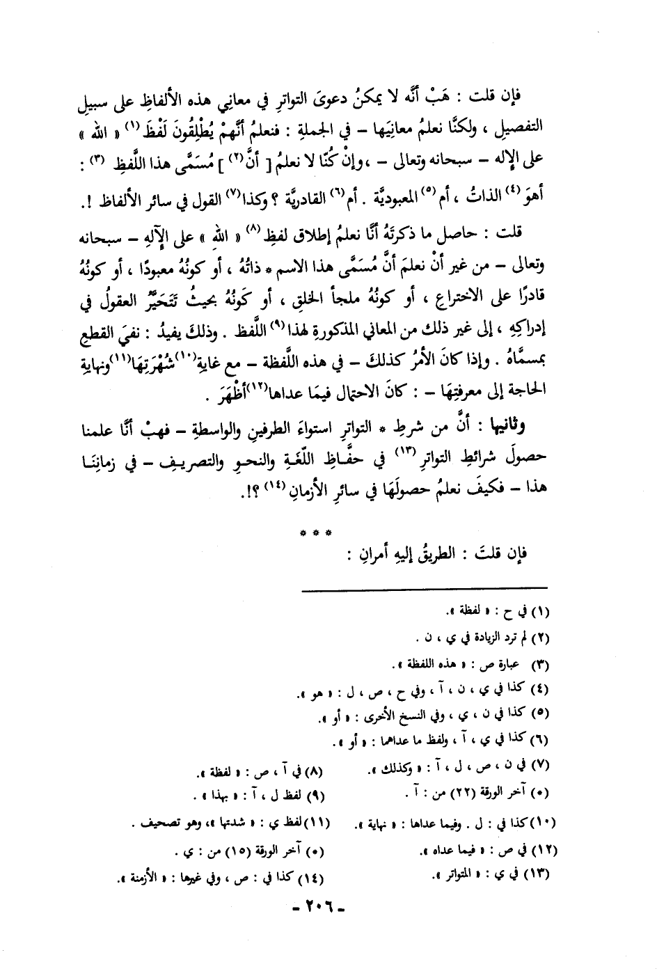 فإن قلت هب إنه لا يمكن دعوى التواتر في معاني هذه الألفاظ على سبيل التفصيل ولكنا نعلم معانيها في الجملة فنعلم أنهم يطلقون لفظ الله على افله علي سبحانه وتعالى وان كنا لا نعلم أن مسمى هذا اللفظ أهو الذات أم المعبودية أم القادرية وكذا القول في سائر الألفاظ قلت حاصل ما ذكرته أنا نعلم إطلاق لفظ الله على الإله سبحانه وتعالى من غير أن نعلم أن مسمى هذا الاسم ذاته أو كونه معبودا أو كونه قادرا على الاختراع أو كونه ملجأ الخلق أو كونه بحيث تتحير العقول في ادراكه إلى غير ذلك من المعاني المذكورة لهذا اللفظ وذلك يفيد نفي القطع بمسماه واذا كان الأمر كذلك في هذه اللفظة مع غاية شهرتها ونهاية الحاجة إلى معرفتها كان الاحتمال فيما عداها أظهر وثانيها أن من شرط التواتر استواء الطرفين والواسطة فهب أنا علمنا حصول شرائط التواتر في حفاظ اللغة والنحو والتصريف في زماننا هذا فكيف نعلم حصولها في سائر الأزمان فان قلت الطريق إليه أمران